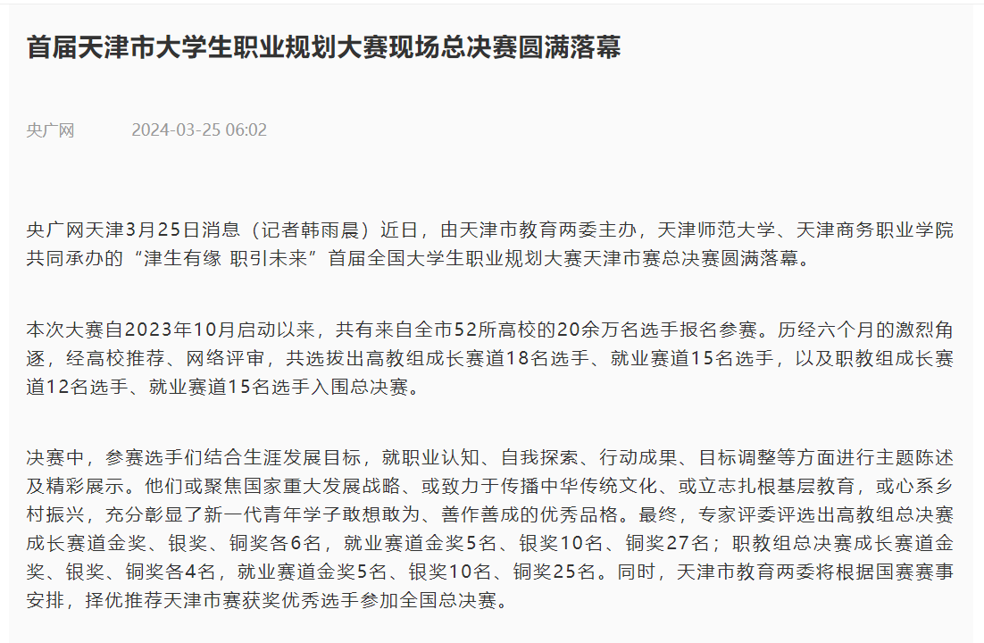 媒體關注 | 【央廣網】首屆天津市大學生職業規劃大賽現場總決賽圓滿落幕