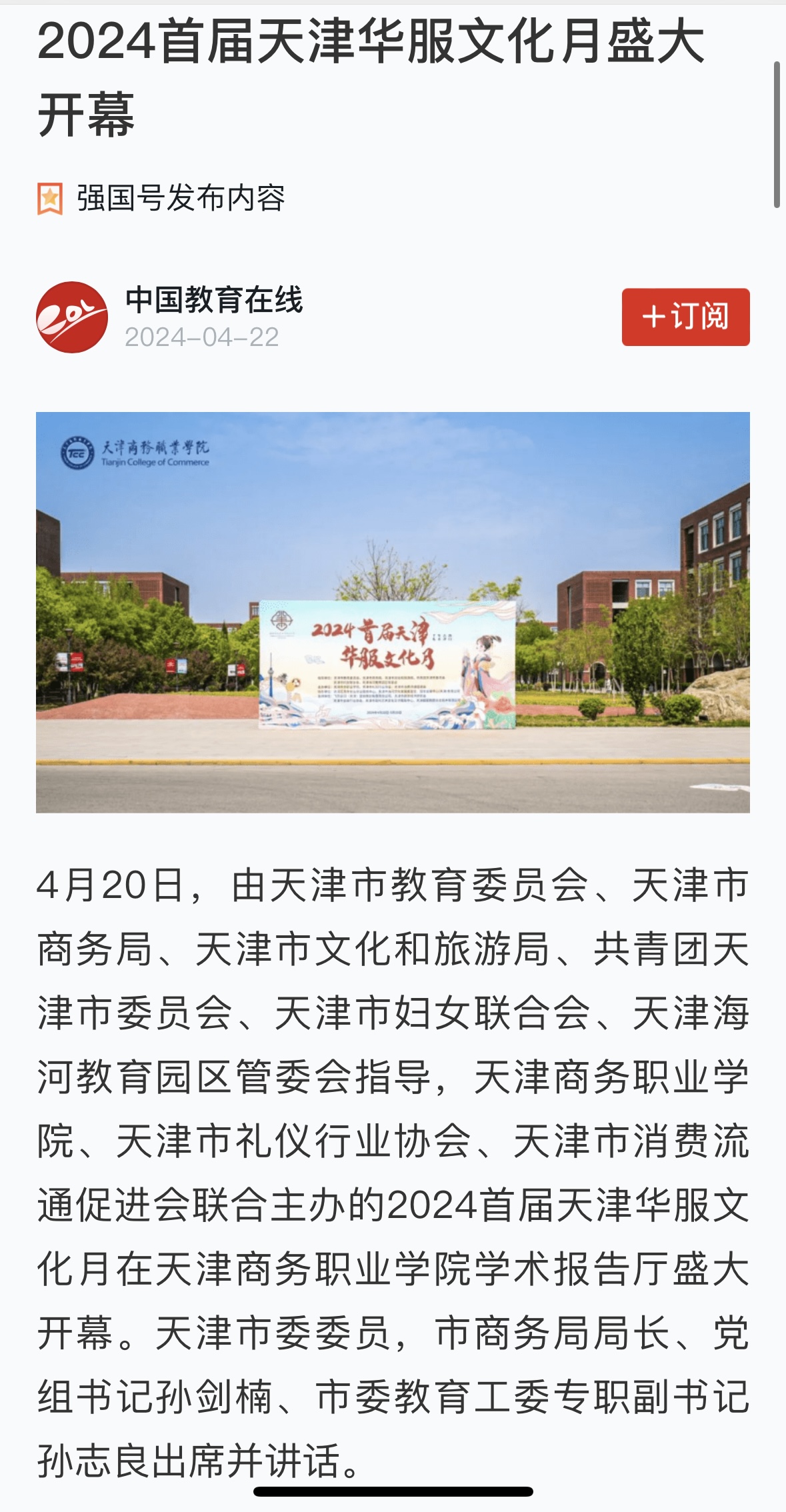 4月20日,由天津市教育委員會、天津市商務局、天津市文化和旅游局、共青團天津市委員會、天津市婦女聯合會、天津海河教育園區管委會指導,天津商務職業學院、天津市禮儀行業協會、天津市消費流通促進會聯合主辦的2024首屆天津華服文化月在天津商務職業學院學術報告廳盛大開幕。天津市委委員,市商務局局長、黨組書記孫劍楠、市委教育工委專職副書記孫志良出席并講話。