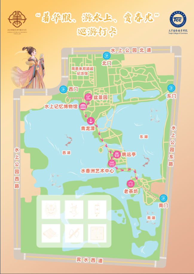 華服文化月開幕以來,引發了社會各界的廣泛反響,也吸引了眾多民眾的目光,目前,各項活動正在如火如荼地進行。5月12日,“著華服、游水上、賞春光”水上公園巡游打卡活動即將拉開序幕,為配合本次巡游打卡活動,華服文化月組委會特別設計了游園打卡明信片,以增強巡游活動的參與度和趣味性。