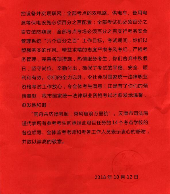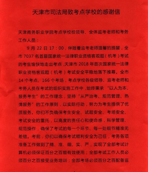 近日,天津市司法局為我校送來感謝信,感謝我校在國家統一法律職業資格考試中所做出的貢獻。