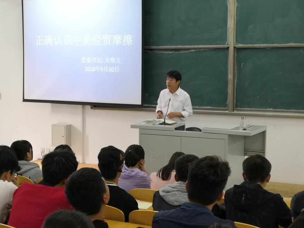 9月30日下午,學校黨委書記吳惟義教授為我校近300名2018級學生骨干作了一場題為正確認識中美經貿摩擦的形勢與政策報告。