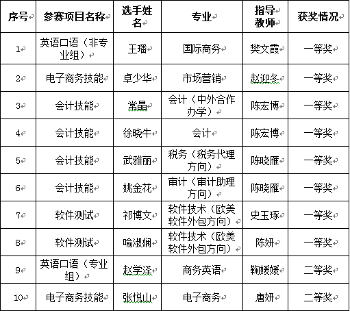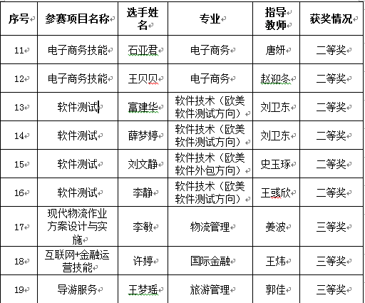 本次大賽,我校共參加了英語口語(專業組、非專業組)、會計技能(教師賽、學生賽)、軟件測試、導游、電子商務技能、互聯網+金融運營技能、市場營銷技能、現代物流作業方案設計與實施、移動互聯網應用軟件等九個賽項。35名參賽選手獲得了8個一等獎、8個二等獎、3個三等獎;兩名教師在教師組比賽中獲得二等獎的好成績。