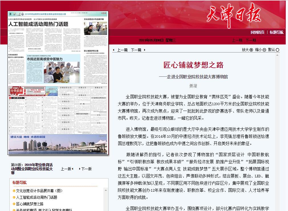 跟隨講解員的指引,記者依次參觀了博物館的“國家頂層設計 中國職教航標”“引領職教改革 教改成果豐碩”“服務經濟發展 助推產業升級”“拓展國際視野 輸出中國標準”“大賽點亮人生 技能成就夢想”五大展示區域。整個博物館通過這五大主題,以圖文并茂、色塊組合、聲像聯動多種形式,結合展板、展臺、LED、觸摸屏等多種載體加以呈現,不同展區用不同色塊進行內容區分,集中展現了全國職業院校技能大賽創辦12年來在制度建設、職教改革、校企合作、國際交流、人才培養等方面取得的成就。