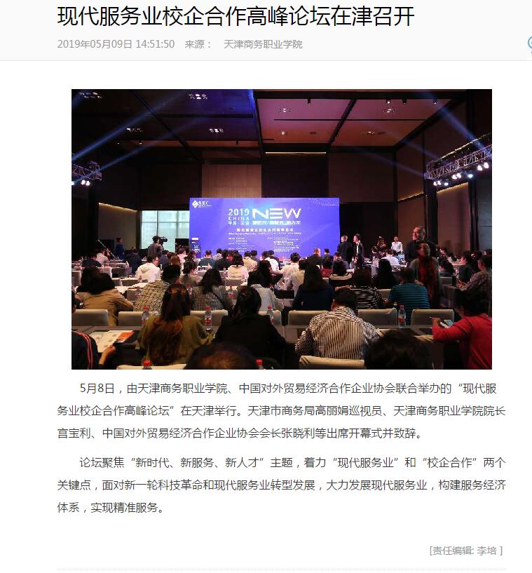 5月8日,由天津商務職業學院、中國對外貿易經濟合作企業協會聯合舉辦的“現代服務業校企合作高峰論壇”在天津舉行。天津市商務局高麗娟巡視員、天津商務職業學院院長宮寶利、中國對外貿易經濟合作企業協會會長張曉利等出席開幕式并致辭。