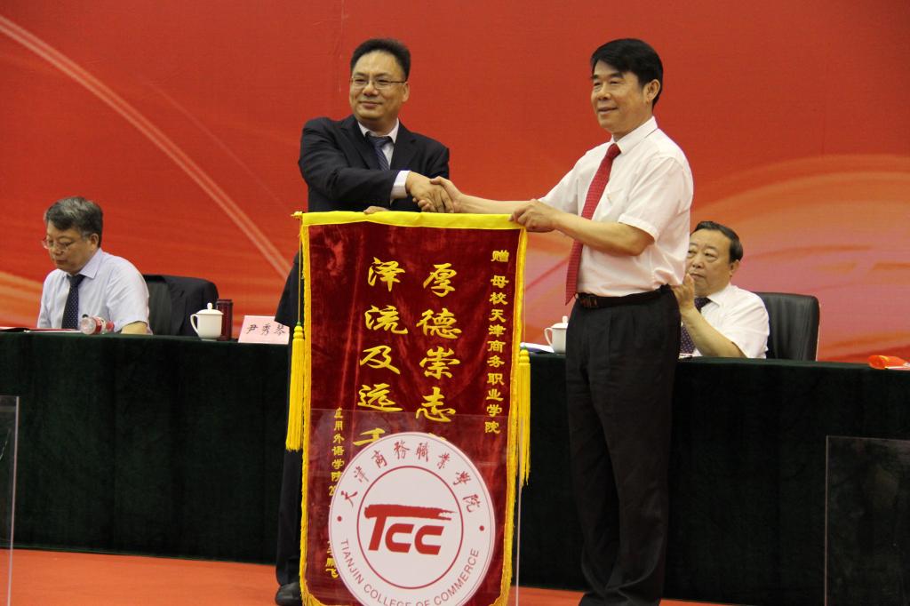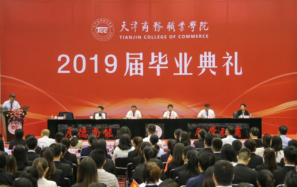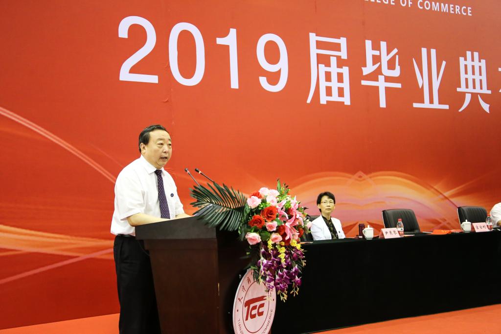 典禮上學校領導向2019屆畢業生頒發畢業證書,并對優秀畢業生進行表彰。國際貿易學院優秀畢業生張喜月代表全體畢業生發言,以感恩為題抒發了畢業生對母校辛勤培養的感謝和即將離校的依依不舍。學校優秀教師代表,2018年度天津市師德先進個人榮寧寧老師勉勵畢業生要敢于下定決心,挑戰自我,實現理想。學校2019年度自強之星,應用外語學院李鵬飛同學家長發表感言,高度評價了學校的育人成果,并向學校贈送“厚德崇志,尚能育才,澤流及遠,千里思源”錦旗以表達感激之情。“中華老字號”天津老美華鞋業服飾有限公司董事長韓志永作為企業嘉賓高度贊賞了學校校企共建的人才培養模式并與2019屆畢業生分享了初入職場的寶貴經驗。
