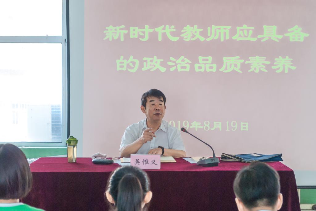 黨委書記吳惟義同志以“新時(shí)代教師應(yīng)具備的政治品質(zhì)素養(yǎng)”為題,從“新時(shí)代”、“政治及政治品質(zhì)”及“教師的政治品質(zhì)素養(yǎng)”三個(gè)方面做了專題講座。吳書記勉勵(lì)新入職教師牢固樹立中國特色社會(huì)主義理想信念,以習(xí)近平總書記重要講話精神為指引,做黨和人民滿意的“四有”好教師。