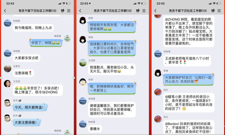 2月17日晚,是個不眠之夜,應用外語學院黨總支連夜統計下沉社區參與疫情防控人員名單,共有11名黨員干部先后收到社區通知,作為市委從商務系統選派的第一批下沉社區干部,于18日清晨開始,奔赴社區防控第一線,每日定崗定時承擔社區防控執勤任務。雖然天氣寒冷,執勤條件艱苦,而且每天執勤4-8個小時,無六日休息,但大家毫無怨言,克服種種困難,體現出商務職業學院黨員干部良好的素質風范。