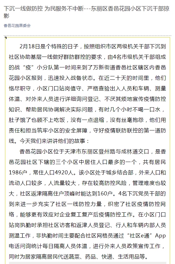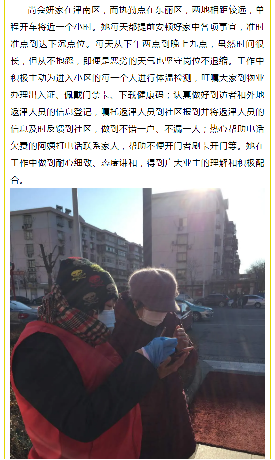 近日,東麗區香邑花園居委會公眾號以《下沉一線做防控 為民服務不中斷---東麗區香邑花園小區下沉干部掠影》為題報道我校科研處教師尚會妍。