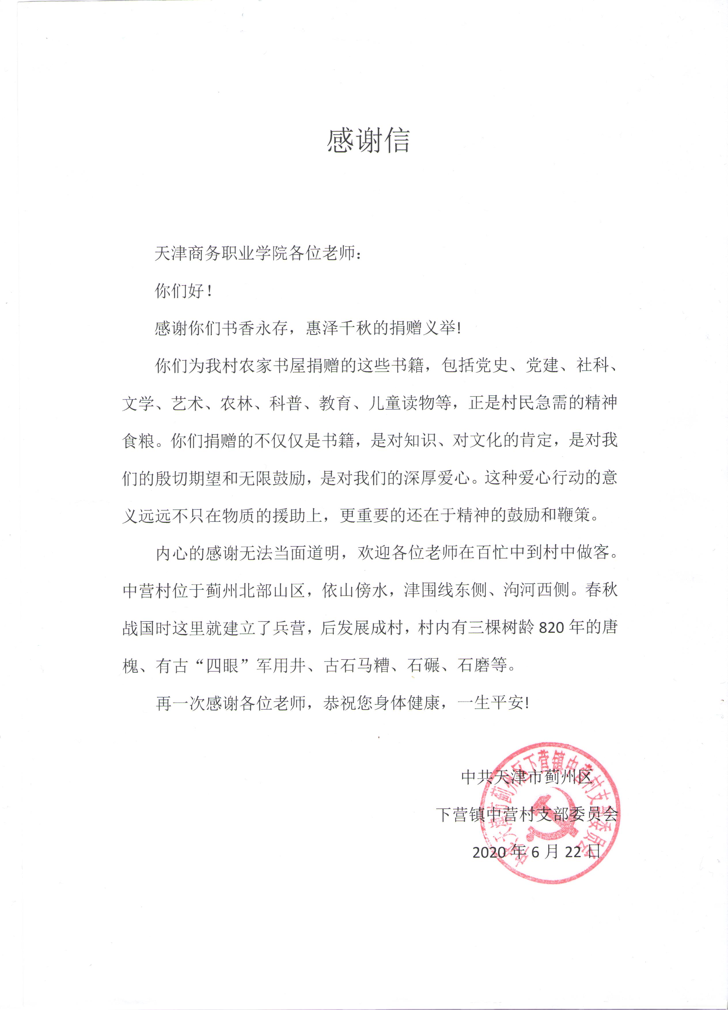 近日,學校工會收到一封來自薊州區下營鎮中營村黨支部的感謝信,中營村黨支部熱情洋溢地表達了對廣大會員職工為農家書屋捐書義舉的謝意。