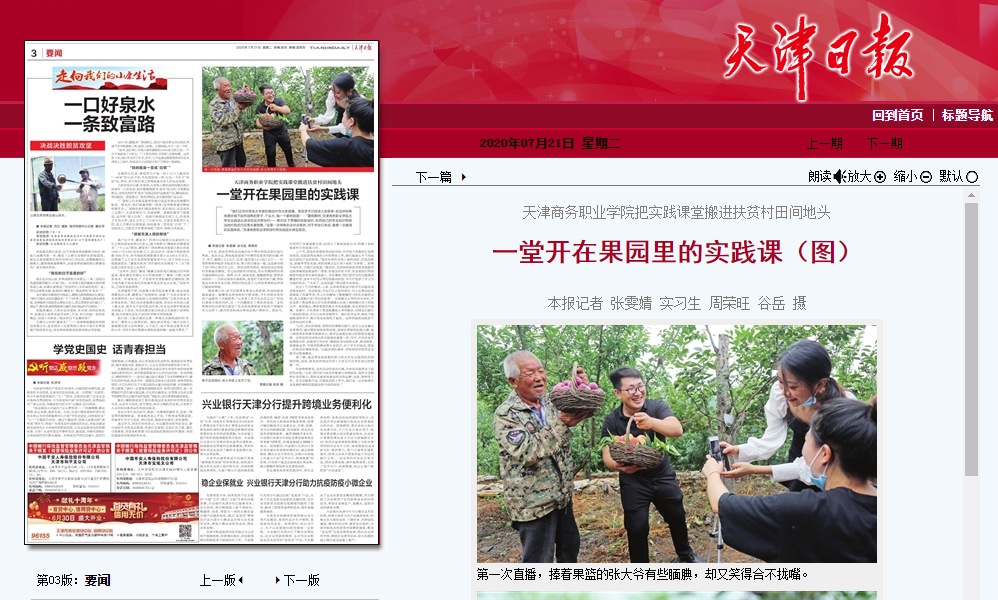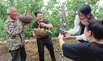 “我們正在村里張大爺家的果園中為大家直播。現(xiàn)在李子已經(jīng)進(jìn)入收獲季,在這種特殊地理環(huán)境下自然成熟的李子,個(gè)頭大,每一個(gè)都特別甜……”暑假期間,天津商務(wù)職業(yè)學(xué)院大學(xué)生實(shí)踐團(tuán)走進(jìn)該校定點(diǎn)幫扶村──薊州區(qū)下營鎮(zhèn)的張家裕村,利用自己的專業(yè)知識(shí)幫助當(dāng)?shù)卮迕襁M(jìn)行應(yīng)季水果銷售?!斑@是一次特殊的點(diǎn)對(duì)點(diǎn)幫扶,對(duì)于學(xué)生們來說,更是一次難得的實(shí)踐體驗(yàn)。”天津商務(wù)職業(yè)學(xué)院駐村幫扶組組長郭金哲說。