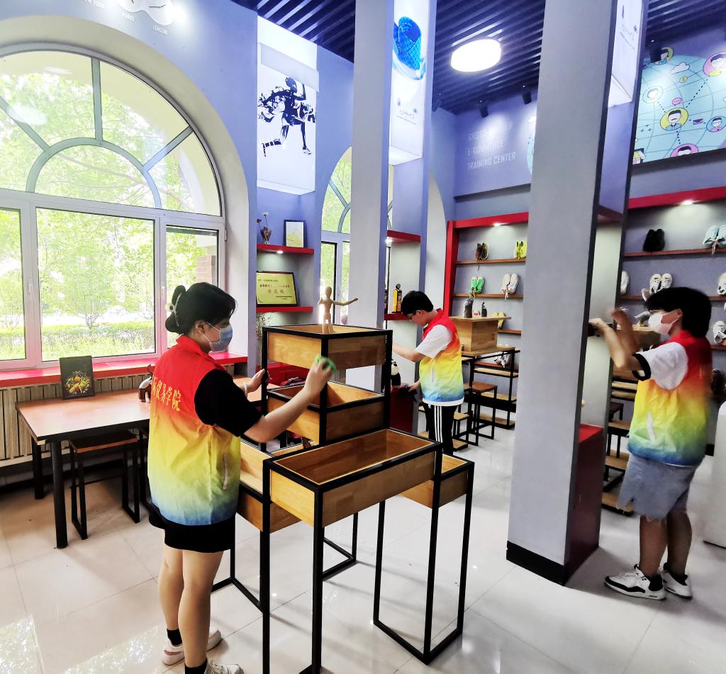 國際貿易學院教職工和部分學生志愿者,緊鑼密鼓地對大賽場地進行賽前布置。邢承劍、林厚良老師冒著酷暑,在競賽場地內設置背板、掛貼宣傳橫幅,營造競賽氛圍。大家通力合作將教學樓、樓道、接待室、展示區等區域打掃得一塵不染,不放過任何衛生死角。
