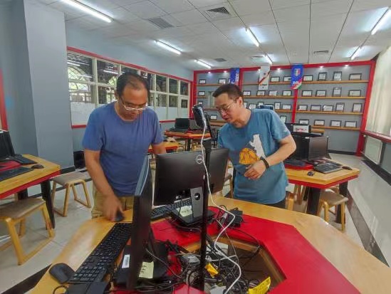 現場競賽場地設置滿足參賽隊伍數量的競賽環境。實訓部劉昕老師和國際貿易學院陸彤老師齊心協力,將比賽所用到的比賽機、裁判機、備用裁判機逐一進行調試,后勤處老師為賽場安裝UPS電源并檢修賽場內外照明,確保大賽期間不出任何差錯。