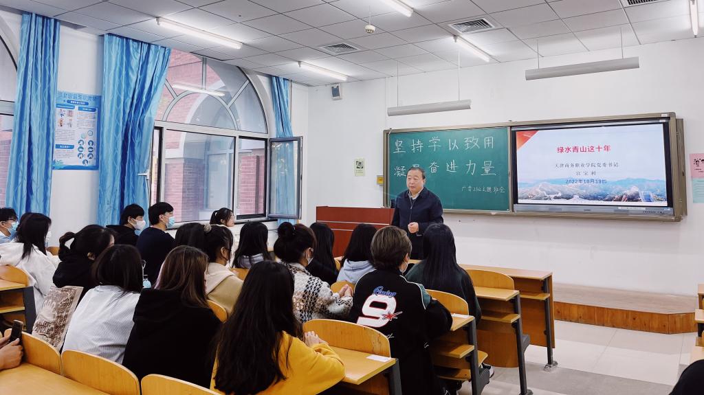 班會后,宮寶利同志為廣告2102班全體同學和廣告學院教師代表、輔導員代表講授主題為《綠水青山這十年》的形勢與政策課。從綠水青山就是金山銀山、天津生態文明建設這十年、美麗中國建設這十年三個角度入手,從宏觀到微觀再到宏觀,詳細講述了生態建設近十年的種種變化,并呼吁同學們深入踐行綠水青山就是金山銀山的理念,愛護生態環境,為建設美麗中國貢獻自己的青春力量。