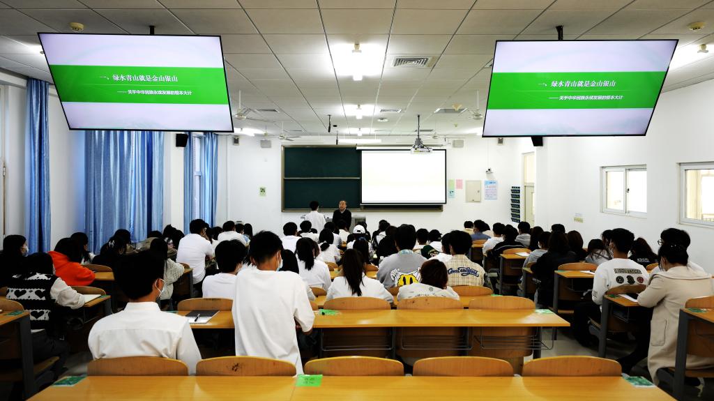 黨委書記宮寶利教授以“綠水青山這十年”為主題,為同學(xué)們聲情并茂地講述了十年來(lái)習(xí)近平生態(tài)文明思想在中國(guó)大地的生動(dòng)實(shí)踐,以詳實(shí)的數(shù)據(jù)介紹了天津精心鑄就的生態(tài)“金飯碗”。授課過程中,通過與學(xué)生的多次親切互動(dòng),引導(dǎo)學(xué)生從自己的家鄉(xiāng)變化中感知發(fā)展成就,引發(fā)學(xué)生的深入思考與情感共鳴。