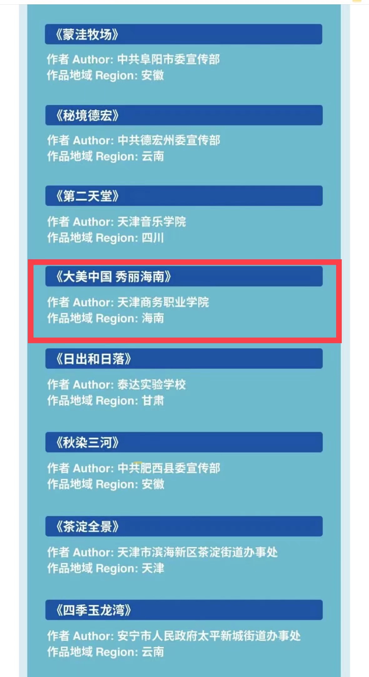 機構組,甘肅省廣播電視總臺移動電視頻道提交的作品《大美中國 我在蘭州》獲得特等獎,云南潤視榮光影業制作有限公司提交的作品《紅河的遠方》獲得最佳視頻獎,安徽省桐城市融媒體中心提交的作品《大美中國·桐城》獲得最佳攝影獎。