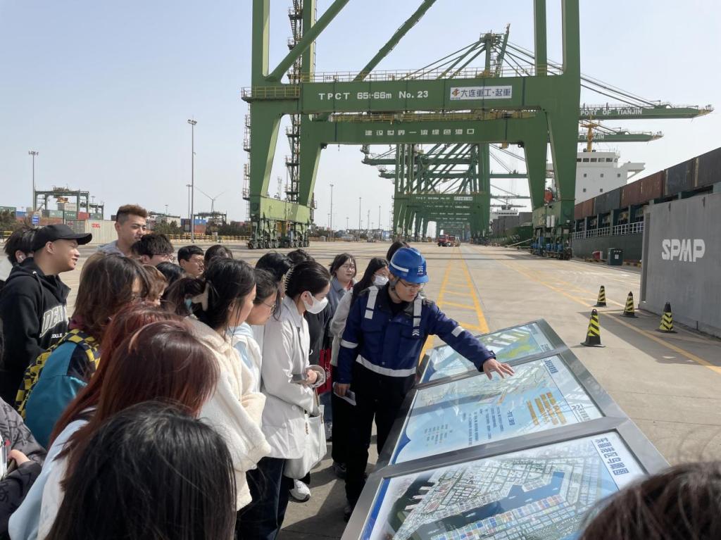 為進一步貫徹黨中央、國務院關于高校畢業生就業工作的決策部署,深化校企合作、推進產教融合,加深學生對專業、行業、企業的認識,助力畢業生高質量就業。近日,天津商務職業學院國際貿易學院港口與航運管理專業2021級同學,在國際貿易學院張明齊院長及港航教研室老師的帶領下,前往天津港太平洋國際集裝箱碼頭有限公司進行參觀實踐學習。天津港太平洋國際集裝箱碼頭有限公司蔡經理參加了活動并進行了深入交流。