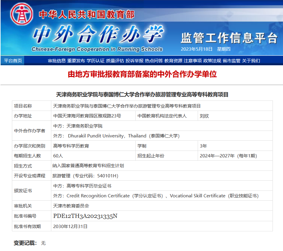 為貫徹落實黨的二十大精神,認真落實全國教育大會精神,積極推進《教育部等八部門關于加快和擴大新時代教育對外開放意見》落地見效,學校積極組織申報中外合作辦學項目。日前,經教育部審批通過,我校與泰國博仁大學合作舉辦的旅游管理專業、廣告藝術設計專業兩個項目成功獲批立項,至此我校成為天津市唯一舉辦中外合作辦學項目的高職院校。這標志著學校國際化辦學工作取得重大進展。