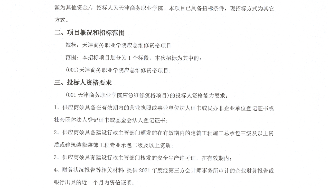 天津商務職業學院應急維修資格項目競爭性磋商公告