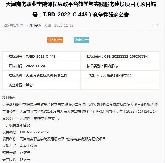 天津商務職業學院課程思政平臺教學與實踐服務建設項目競爭性磋商公告