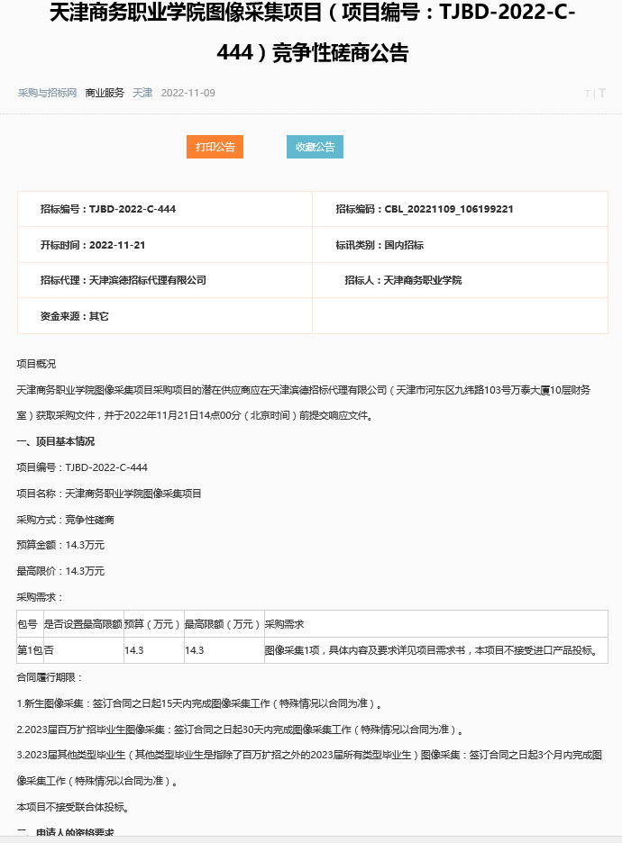 天津商務職業學院圖像采集項目競爭性磋商公告