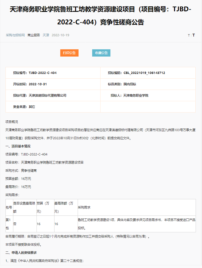 天津商務職業學院魯班工坊教學資源建設項目(項目編號:TJBD-2022-C-404)競爭性磋商公告