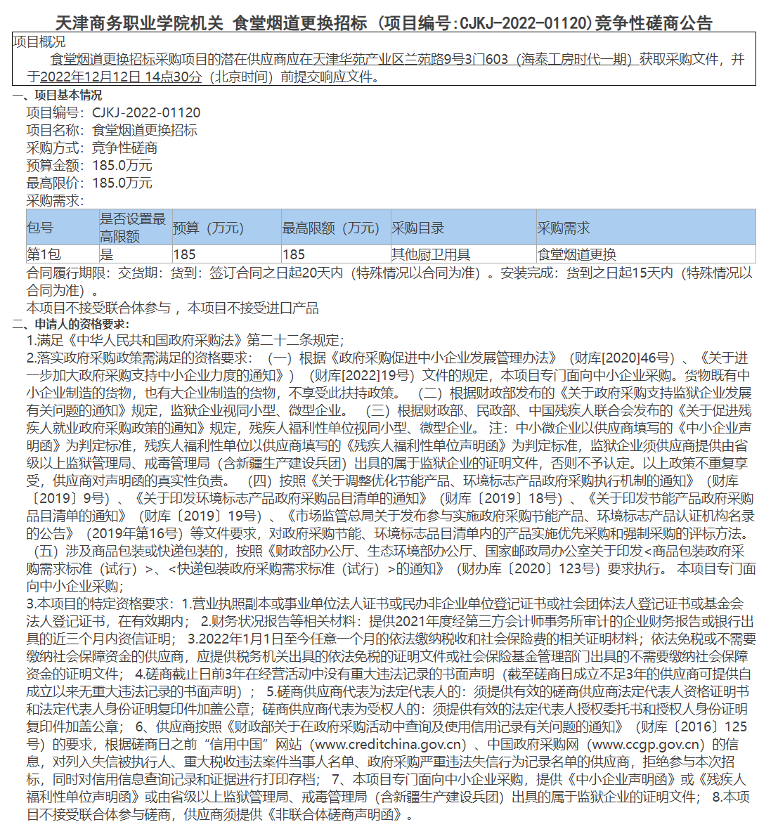 天津商務職業學院機關 食堂煙道更換招標(項目編號:CJKJ-2022-01120)競爭性磋商公告
