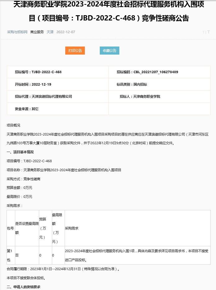 天津商務(wù)職業(yè)學(xué)院2023-2024年度社會(huì)招標(biāo)代理服務(wù)機(jī)構(gòu)入圍項(xiàng)目競(jìng)爭(zhēng)性磋商公告