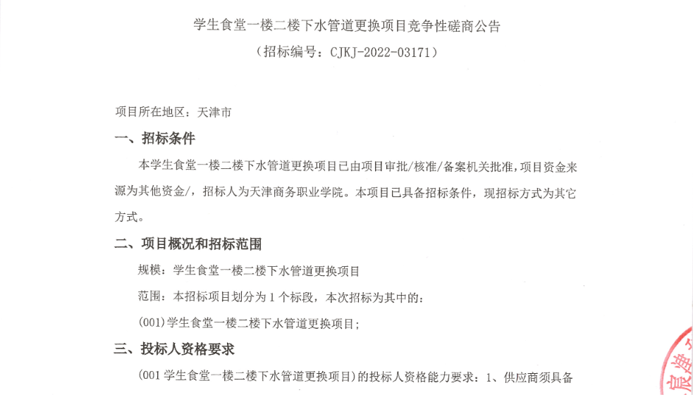學(xué)生食堂一樓二樓下水管道更換項(xiàng)目競(jìng)爭(zhēng)性磋商公告