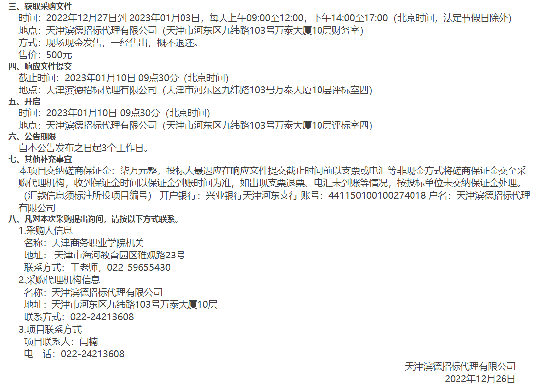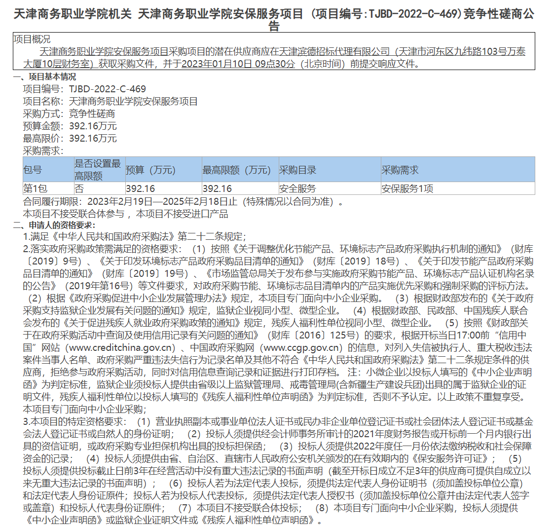 天津商務職業學院安保服務項目(項目編號:TJBD-2022-C-469)競爭性磋商公告