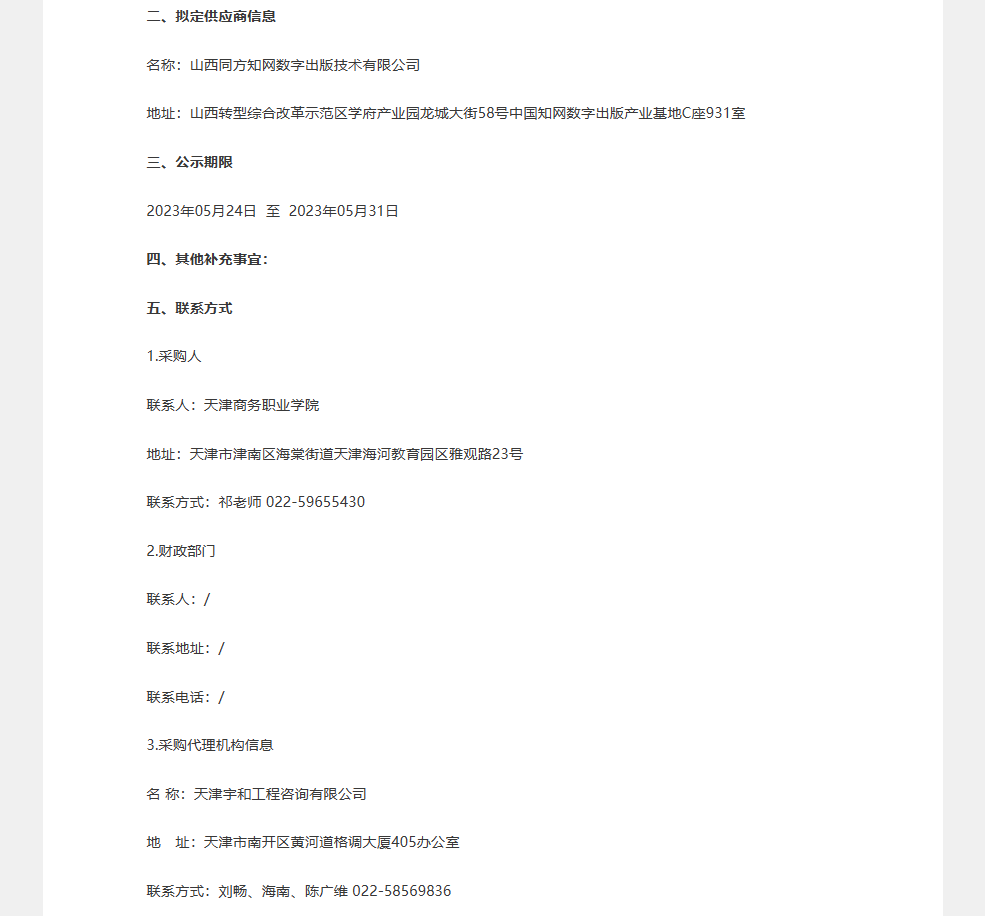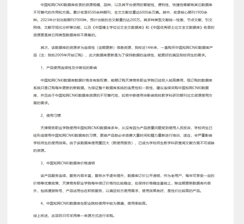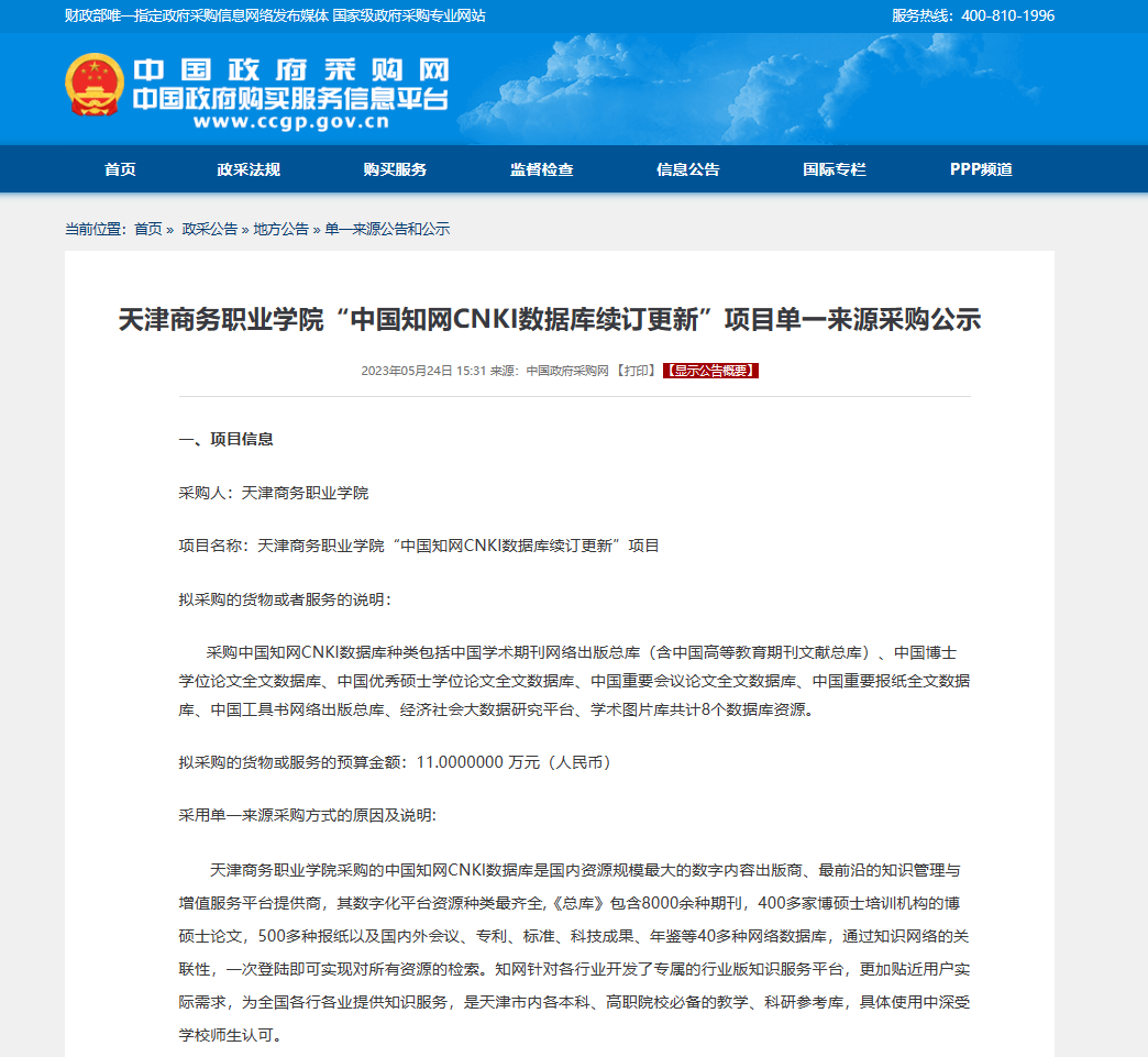 天津商務(wù)職業(yè)學(xué)院“中國知網(wǎng)CNKI數(shù)據(jù)庫續(xù)訂更新”項(xiàng)目單一來源采購公示