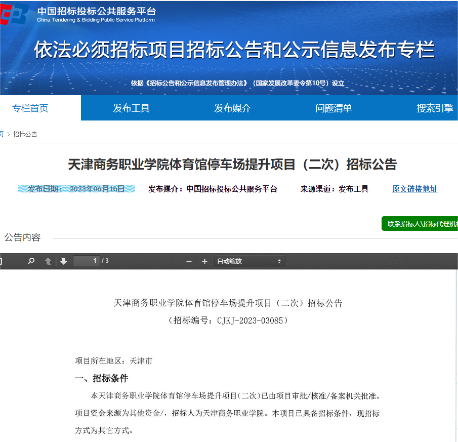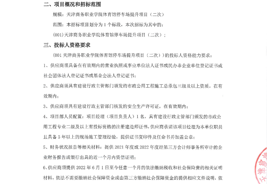 天津商務職業學院體育館停車場提升項目(二次)招標公告