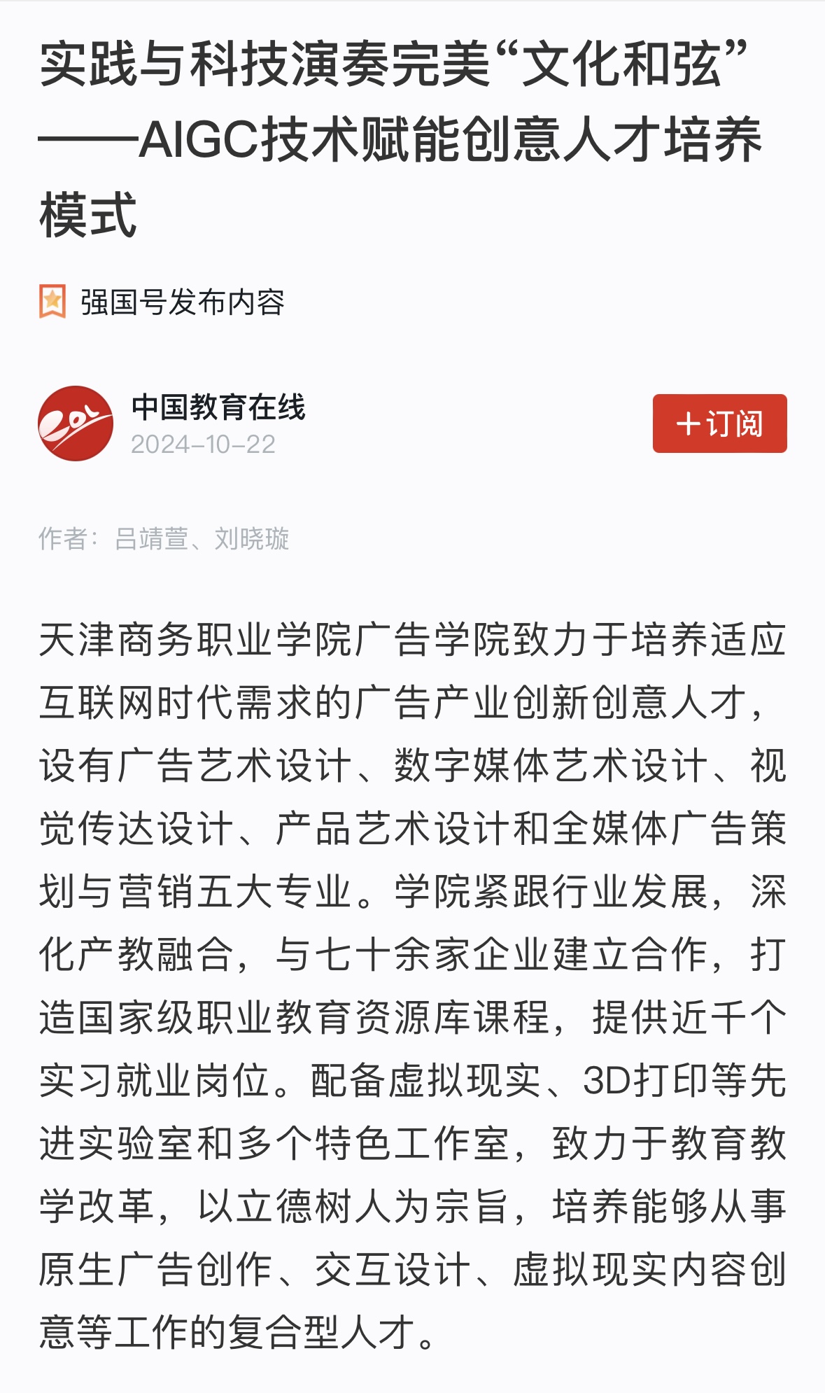 在當今數字技術蓬勃發展的背景下,人工智能生成內容(AIGC)技術正對廣告行業及相關產業產生深遠的影響,重塑內容創作模式及產業生態。天津商務職業學院廣告學院敏銳地洞察到這一趨勢,積極擁抱變革,將AIGC技術全面融入教學與實踐,為學生提供技術前沿的學習平臺和豐富的實踐實習機會,致力于培養適應未來廣告行業發展需求的創新型人才。
