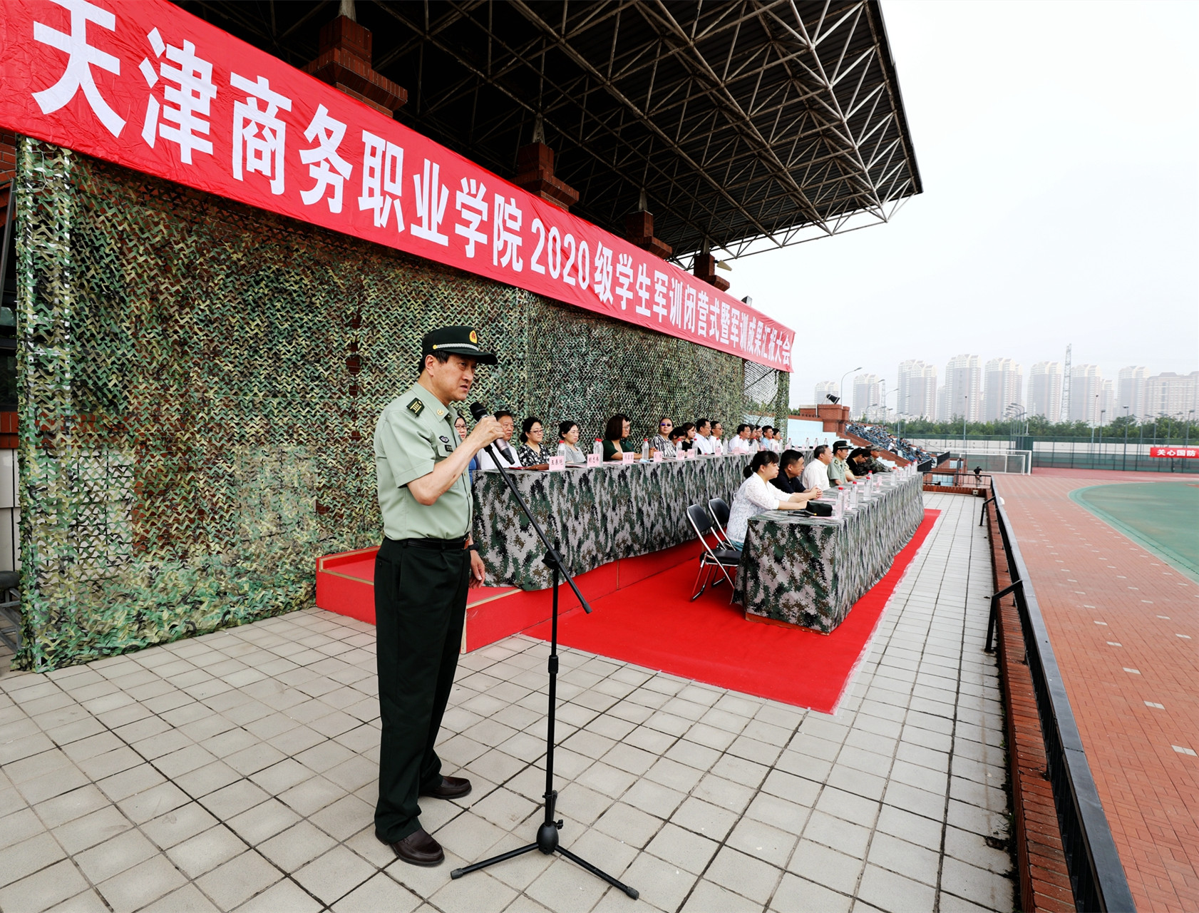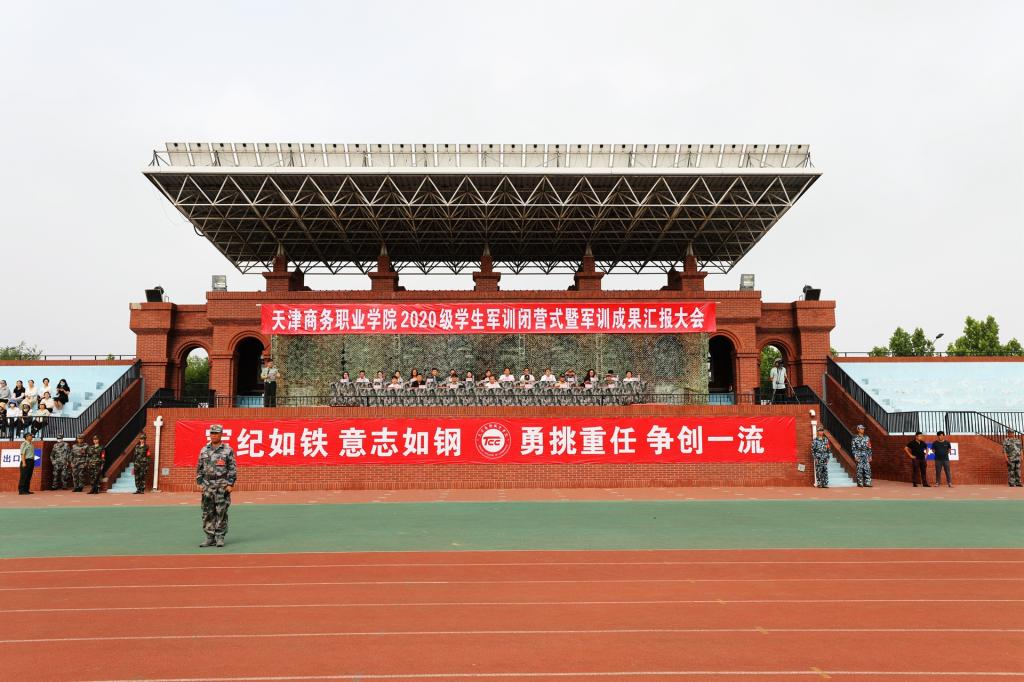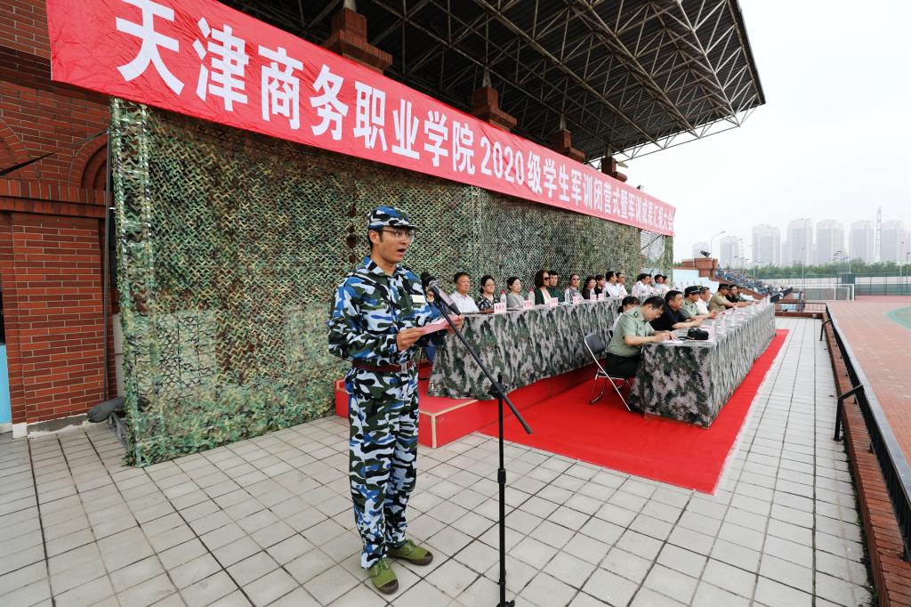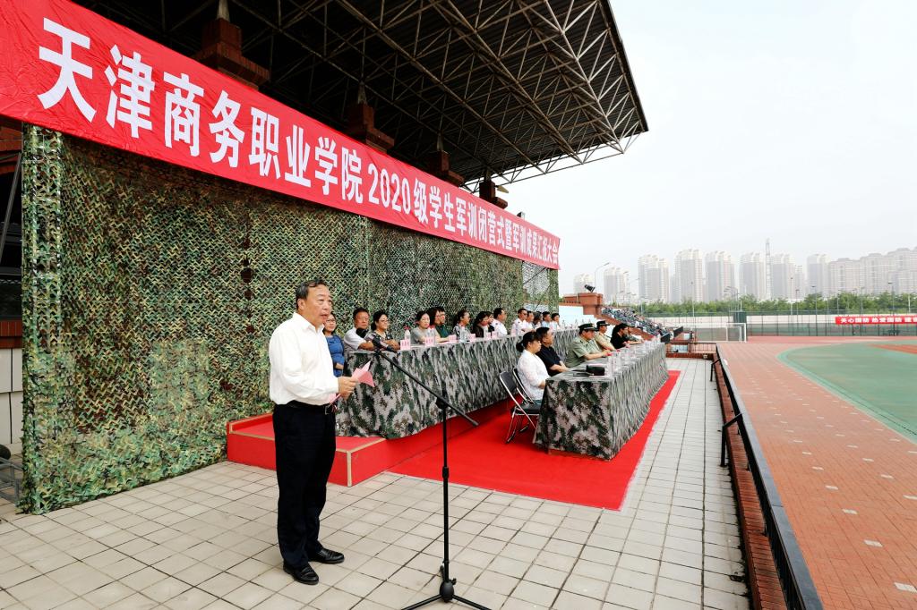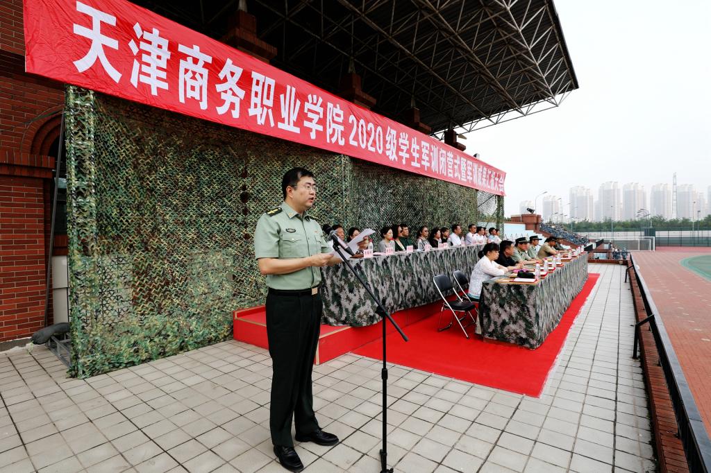 紅色七月,迷彩戎裝。2020年7月16日上午8時(shí),天津商務(wù)職業(yè)學(xué)院2020級(jí)學(xué)生軍訓(xùn)閉營(yíng)式暨軍訓(xùn)成果匯報(bào)大會(huì)在學(xué)校體育場(chǎng)隆重舉行。天津警備區(qū)學(xué)生軍訓(xùn)辦公室主任辛維剛大校,河西區(qū)人民武裝部黃孝喜部長(zhǎng)、邢勇政委,天津市金諾恒遠(yuǎn)國(guó)防教育訓(xùn)練中心高繼安主任、劉尚勤副主任,學(xué)校黨委宮寶利書(shū)記出席大會(huì),學(xué)校黨委宣傳部、黨委學(xué)生工作部、團(tuán)委負(fù)責(zé)同志、各學(xué)院黨總支書(shū)記、院長(zhǎng)、副書(shū)記,全體輔導(dǎo)員、軍訓(xùn)教官,2020級(jí)全體參訓(xùn)學(xué)生參加大會(huì)。