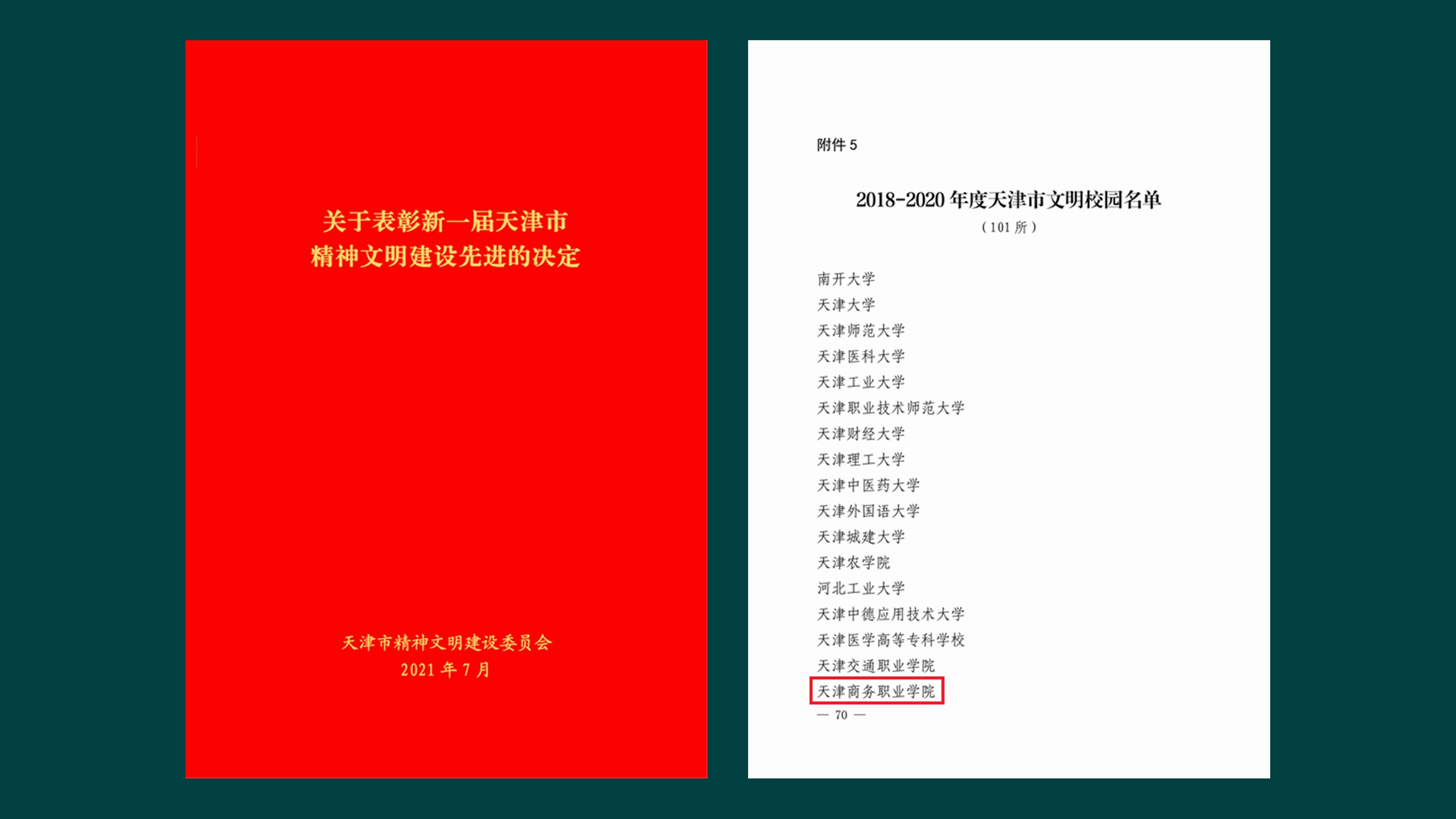 日前,天津市文明委公布《關于表彰新一屆天津市精神文明建設先進的決定》,我校榮獲“2018-2020年度天津市文明校園”榮譽稱號。