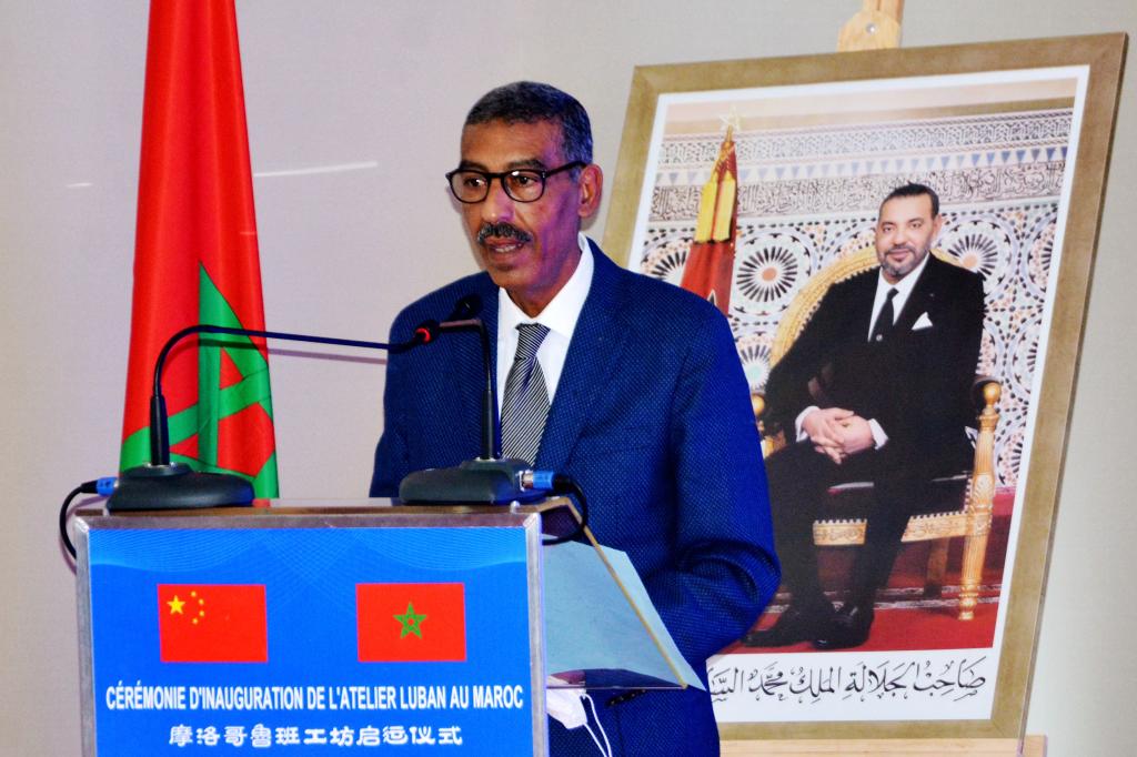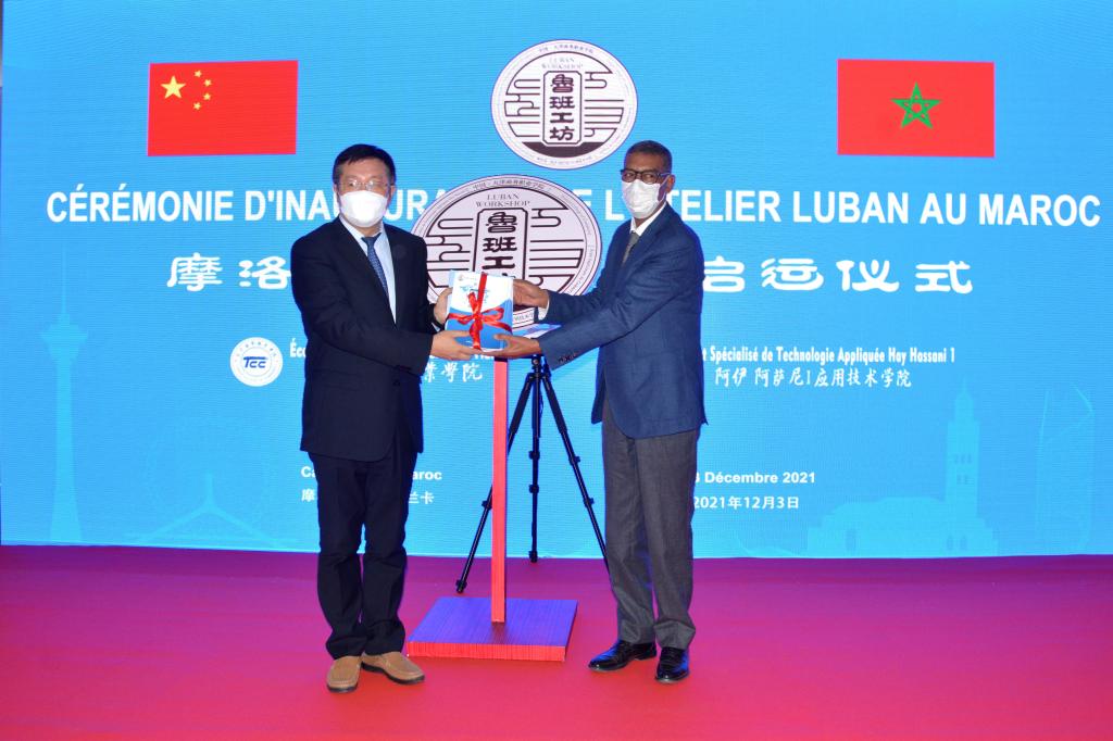 在與會人員的見證下,中國駐摩洛哥大使李昌林先生和摩洛哥職業教育與就業發展辦公室總主管盧波?娜泰沙女士共同為摩洛哥魯班工坊揭牌。隨后,李昌林大使還代表天津商務職業學院向摩洛哥阿伊 阿薩尼 1 應用技術學院交付了中法雙語教材和國際化專業教學標準。
