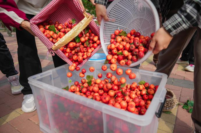 學生們在樹木養護師傅、勞動教育課任課教師和輔導員老師的具體指導下,自制采摘工具,分組進行山楂樹采摘勞動體驗,共同享受豐收的喜悅。經過師生員工近4個小時的共同努力,共計采摘收獲山楂約300斤,紅彤彤的勞動果實裝滿了籃子,學生們抱著滿筐山楂拍照留念,用鏡頭記錄下勞動的喜悅!