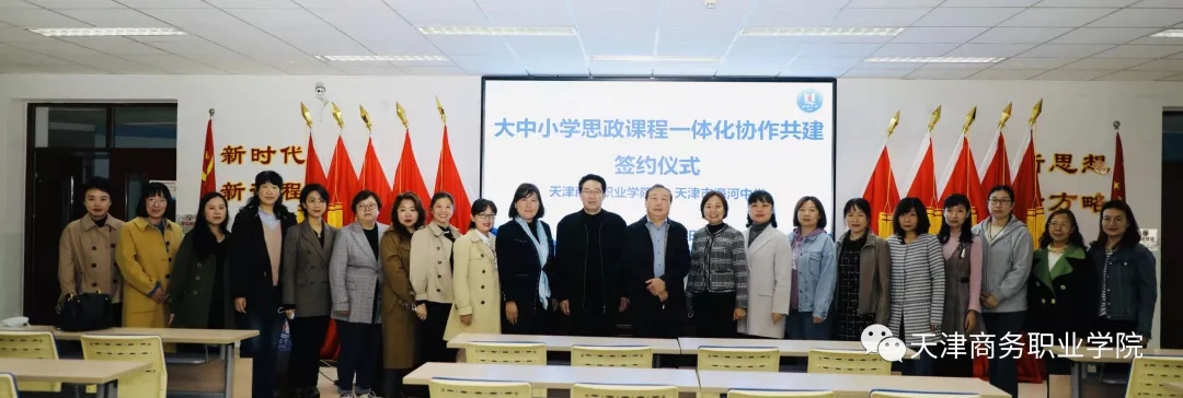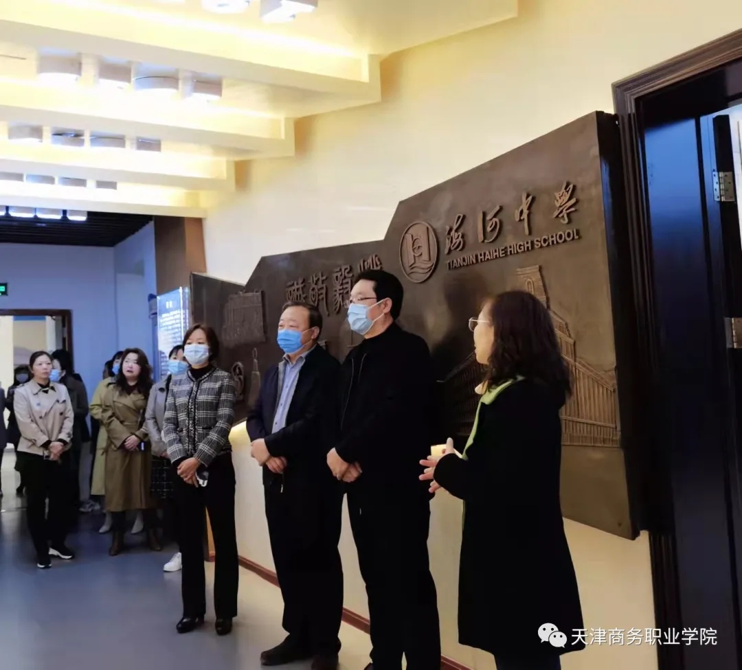 天津市海河中學黨委書記卞永海在致辭時表示,希望通過此次共建,加強兩校的溝通交流,使得海河中學在育人模式和思政課教學資源等方面有新的突破。天津商務職業學院黨委書記宮寶利在致辭中表示,海河中學是一所百年名校,在天津教育發展史上有著舉足輕重的地位,在推動現代職業教育高質量發展的大前提下,希望通過大中小學思政課一體化共建使我校思政課教學更好的與中學階段進行銜接,進一步提高思政課的針對性和有效性,不斷探索一體化共建的新模式、新路子,著力形成共同建設、共同促進、共同發展育人新局面,對于更好落實立德樹人根本任務具有重大意義。雙方在熱烈友好的氣氛中就今后思政課程、德育工作、專業技能等方面達成了合作意向,并簽署了共建協議。兩校未來將從思政課一體化教學研究、政治學科教材理論研究、探究性課題研究、實踐基地研學等方面開展交流合作共建,為共謀思政教育發展的新篇章貢獻助力。簽約儀式后,與會人員參觀了海河中學教育博物館。