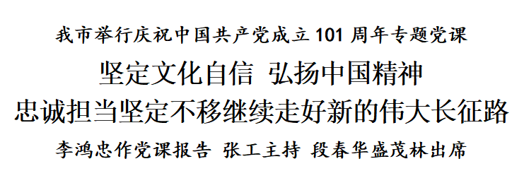 6月30日上午,我市在市委黨校舉行慶祝中國共產黨成立101周年專題黨課,這是十二屆市委舉行的首次“七一”專題黨課,是自2017年以來市委第6次以維護習近平總書記黨中央的核心、全黨的核心地位為主題的“七一”專題黨課,也是認真貫徹市第十二次黨代會精神,深入開展忠誠教育,以實際行動迎接黨的二十大勝利召開的重要工作安排。市委書記李鴻忠作黨課報告,市委副書記、代市長張工主持,市人大常委會主任段春華、市政協主席盛茂林出席。