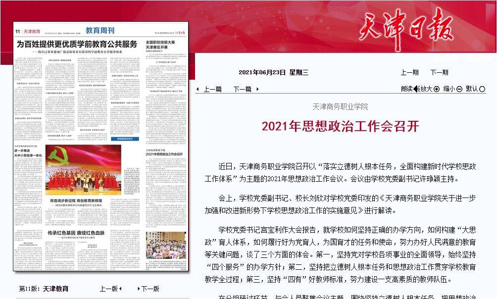 6月23日《天津日報》第11版“教育周刊”以《2021年思想政治工作會召開》為題,報道我校召開以“落實立德樹人根本任務,全面構建新時代學校思政工作體系”為主題的2021年思想政治工作會議。