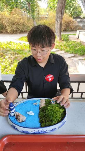 決賽現場,我校學生與9所進入決賽的高校學生一起同臺競技。張廣濤同學以“遠方的我”為主題,通過小巧的植物布景和精致的設計,將微小的空間變成了一個富有生機和美感的世界,展示了一名即將實習的學生堅定、有力、整裝待發的心理狀態。作品不僅展示了學生的創造力和藝術才華,還傳遞了其對心靈平靜及社會環境、自然環境的關注。在創作過程中不僅體驗了植物的美麗和能量,同時也通過微景觀的構建表達了對心理健康的重視。