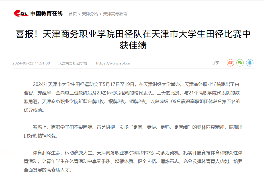 2024年天津市大學生田徑運動會于5月17日至19日,在天津財經大學舉辦。天津商務職業學院派出了由曹智、郭蘊華、金尚璐三位教練員及29名運動員組成的校代表隊。三天的比拼,與21個高職學院代表隊的激烈角逐,天津商務職業學院斬獲金牌1枚、銀牌2枚、銅牌2枚,以總成績109分贏得高職組團體總分第五名的優異成績。