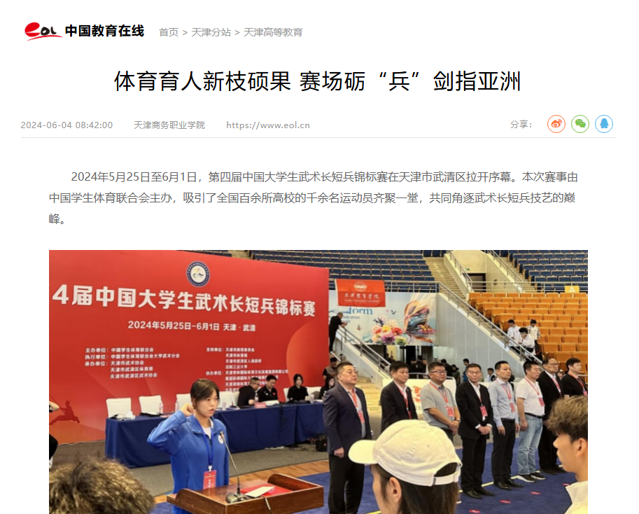 2024年5月25日至6月1日,第四屆中國大學生武術長短兵錦標賽在天津市武清區拉開序幕。本次賽事由中國學生體育聯合會主辦,吸引了全國百余所高校的千余名運動員齊聚一堂,共同角逐武術長短兵技藝的巔峰。