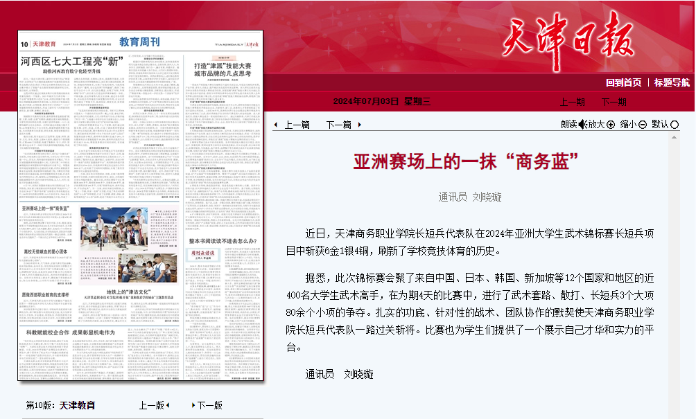 近日,天津商務職業(yè)學院長短兵代表隊在2024年亞洲大學生武術(shù)錦標賽長短兵項目中斬獲6金1銀4銅,刷新了學校競技體育的歷史。