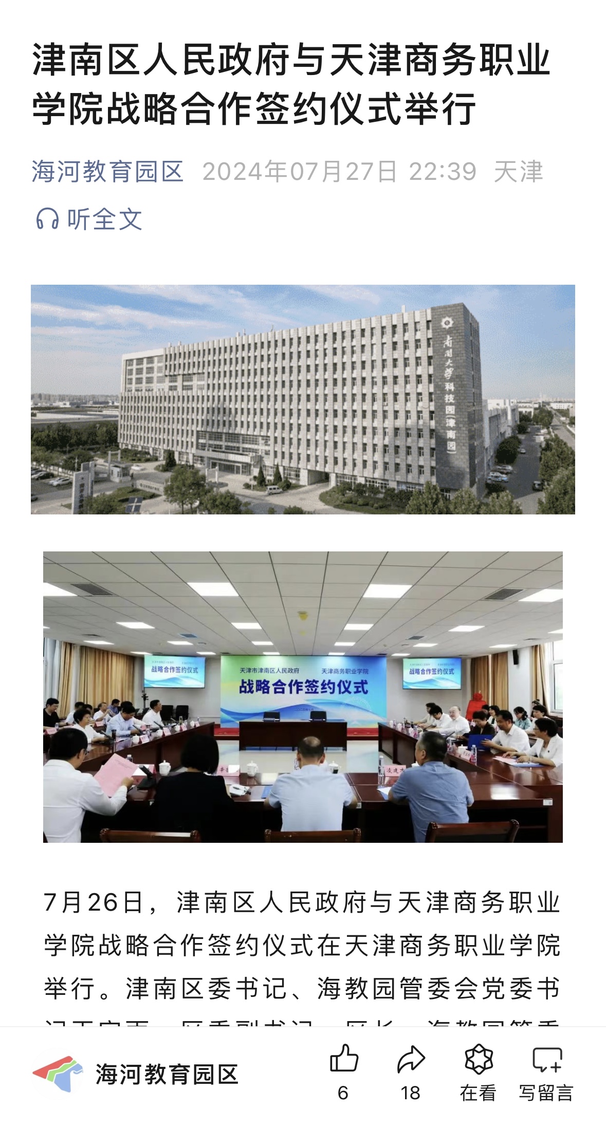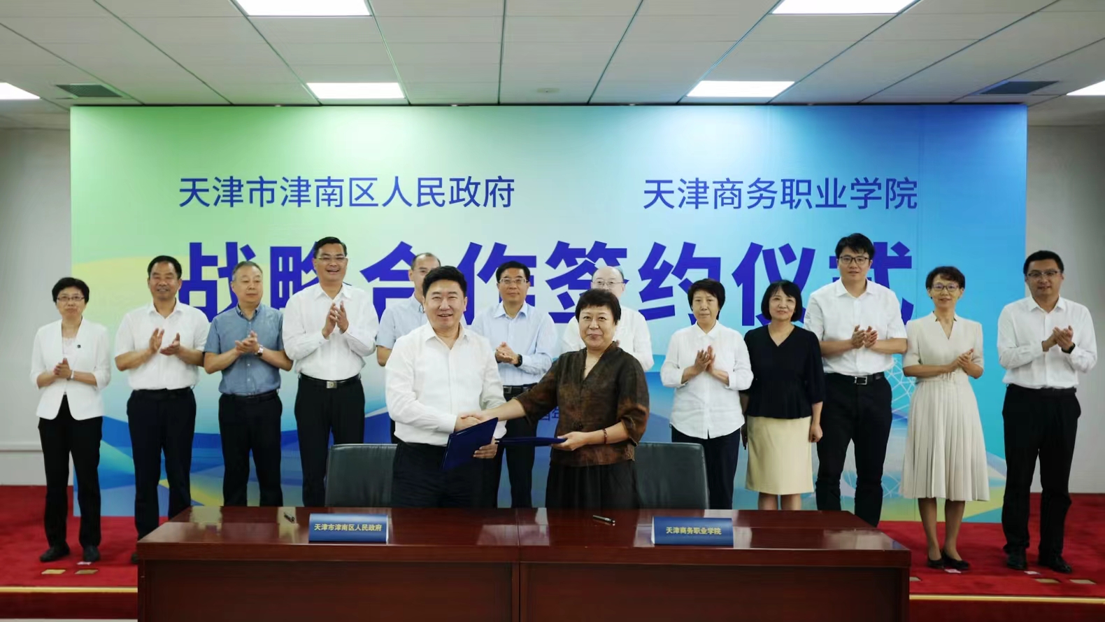 7月26日,津南區人民政府與天津商務職業學院戰略合作簽約儀式在天津商務職業學院舉行。津南區委書記、海教園管委會黨委書記王寶雨,區委副書記、區長、海教園管委會黨委副書記、主任楊灝,天津商務職業學院黨委書記馬雷,黨委副書記、院長劉欣出席并講話,天津海關、市商務局、市市場監管委、天開集團相關負責同志出席。