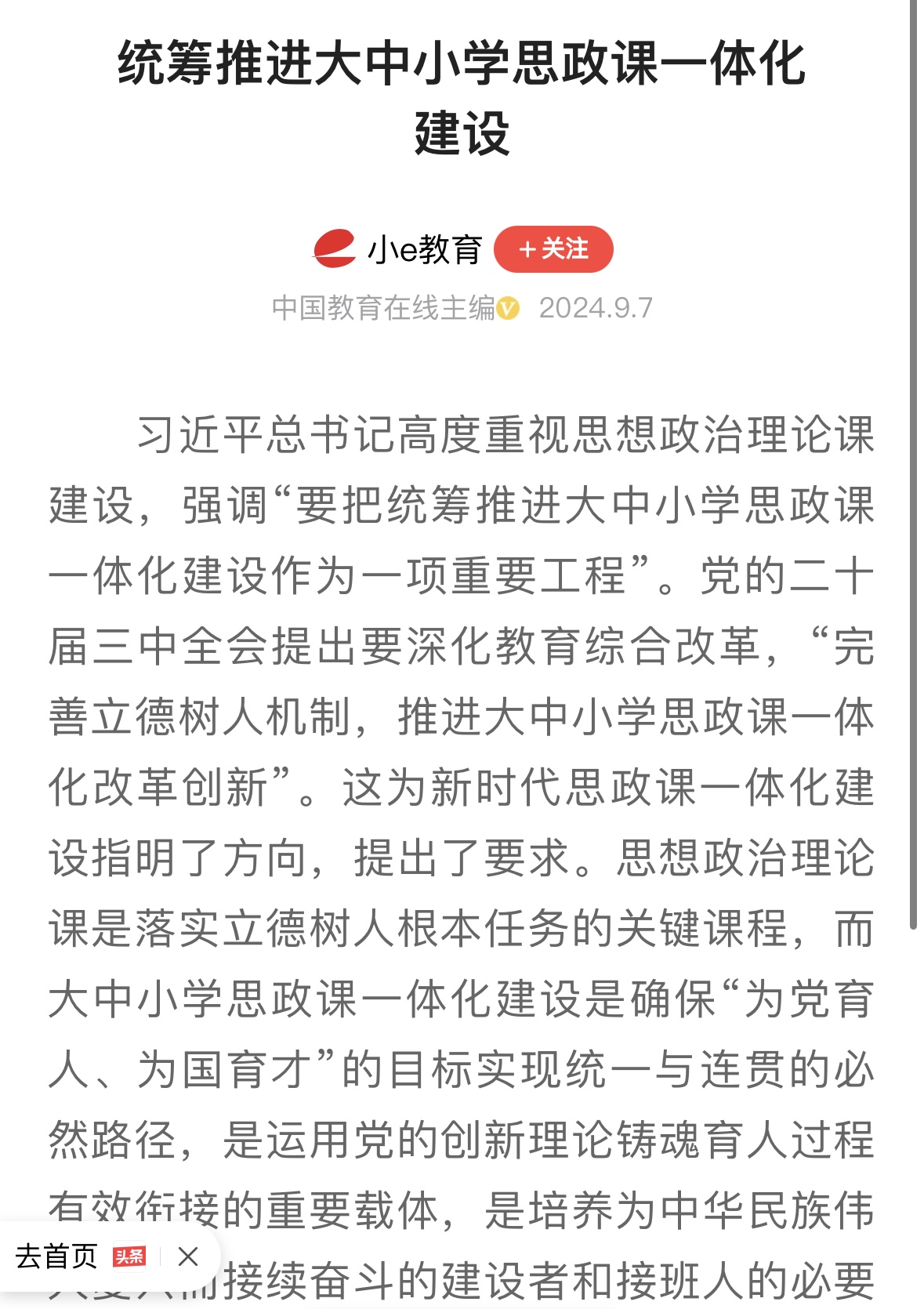 習(xí)近平總書記高度重視思想政治理論課建設(shè),強(qiáng)調(diào)“要把統(tǒng)籌推進(jìn)大中小學(xué)思政課一體化建設(shè)作為一項(xiàng)重要工程”。黨的二十屆三中全會提出要深化教育綜合改革,“完善立德樹人機(jī)制,推進(jìn)大中小學(xué)思政課一體化改革創(chuàng)新”。這為新時代思政課一體化建設(shè)指明了方向,提出了要求。思想政治理論課是落實(shí)立德樹人根本任務(wù)的關(guān)鍵課程,而大中小學(xué)思政課一體化建設(shè)是確保“為黨育人、為國育才”的目標(biāo)實(shí)現(xiàn)統(tǒng)一與連貫的必然路徑,是運(yùn)用黨的創(chuàng)新理論鑄魂育人過程有效銜接的重要載體,是培養(yǎng)為中華民族偉大復(fù)興而接續(xù)奮斗的建設(shè)者和接班人的必要環(huán)節(jié)。統(tǒng)籌推進(jìn)大中小學(xué)思政課一體化建設(shè),要堅持理論自信、與時俱進(jìn)與知行合一,運(yùn)用好“系統(tǒng)觀念”,統(tǒng)籌一體化建設(shè)的目標(biāo)、師資、教材、方法和評價這五大抓手,培養(yǎng)堪當(dāng)強(qiáng)國建設(shè)、民族復(fù)興大任的棟梁之材。