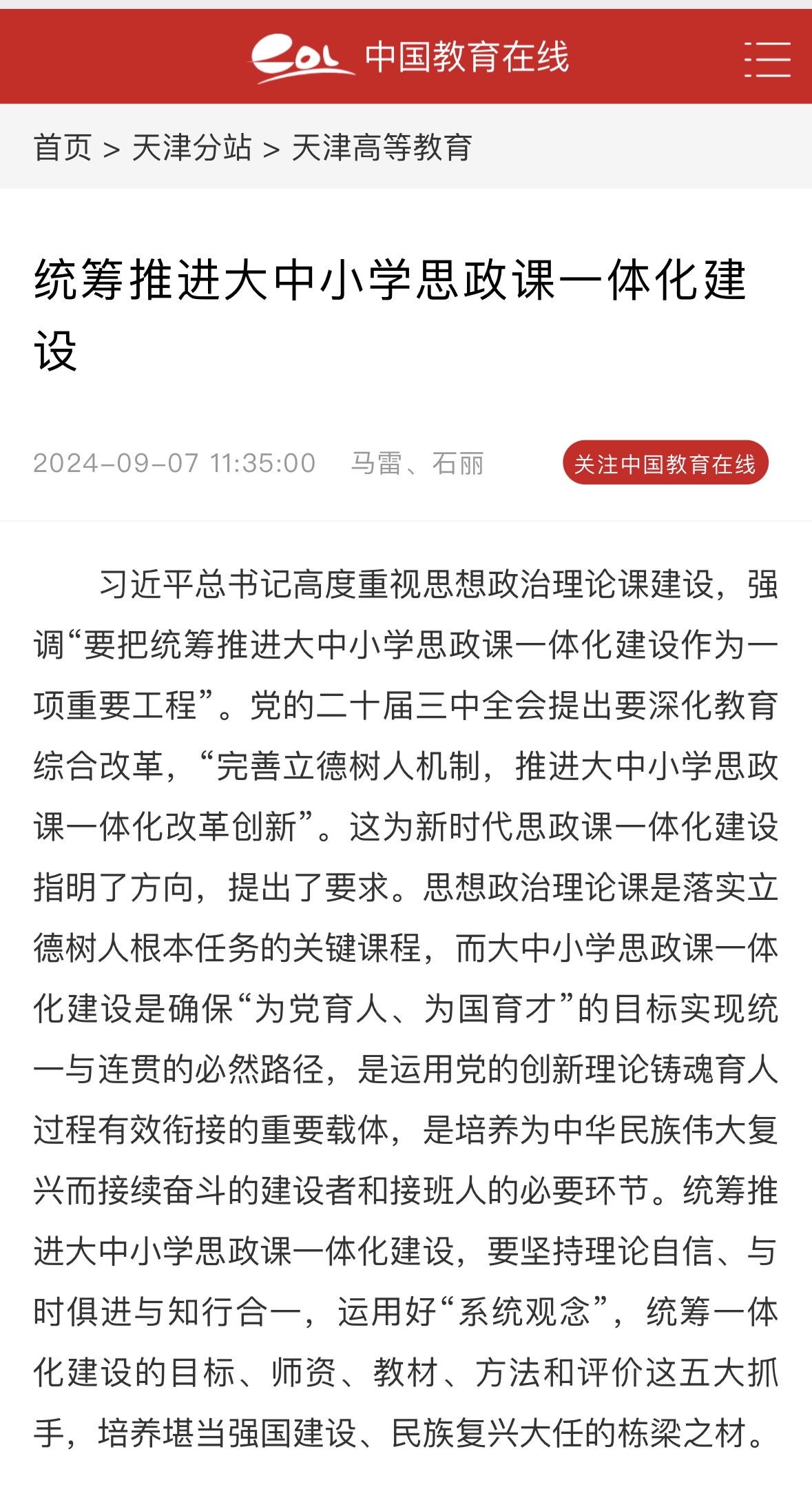 習近平總書記高度重視思想政治理論課建設,強調“要把統(tǒng)籌推進大中小學思政課一體化建設作為一項重要工程”。黨的二十屆三中全會提出要深化教育綜合改革,“完善立德樹人機制,推進大中小學思政課一體化改革創(chuàng)新”。這為新時代思政課一體化建設指明了方向,提出了要求。思想政治理論課是落實立德樹人根本任務的關鍵課程,而大中小學思政課一體化建設是確保“為黨育人、為國育才”的目標實現(xiàn)統(tǒng)一與連貫的必然路徑,是運用黨的創(chuàng)新理論鑄魂育人過程有效銜接的重要載體,是培養(yǎng)為中華民族偉大復興而接續(xù)奮斗的建設者和接班人的必要環(huán)節(jié)。統(tǒng)籌推進大中小學思政課一體化建設,要堅持理論自信、與時俱進與知行合一,運用好“系統(tǒng)觀念”,統(tǒng)籌一體化建設的目標、師資、教材、方法和評價這五大抓手,培養(yǎng)堪當強國建設、民族復興大任的棟梁之材。
