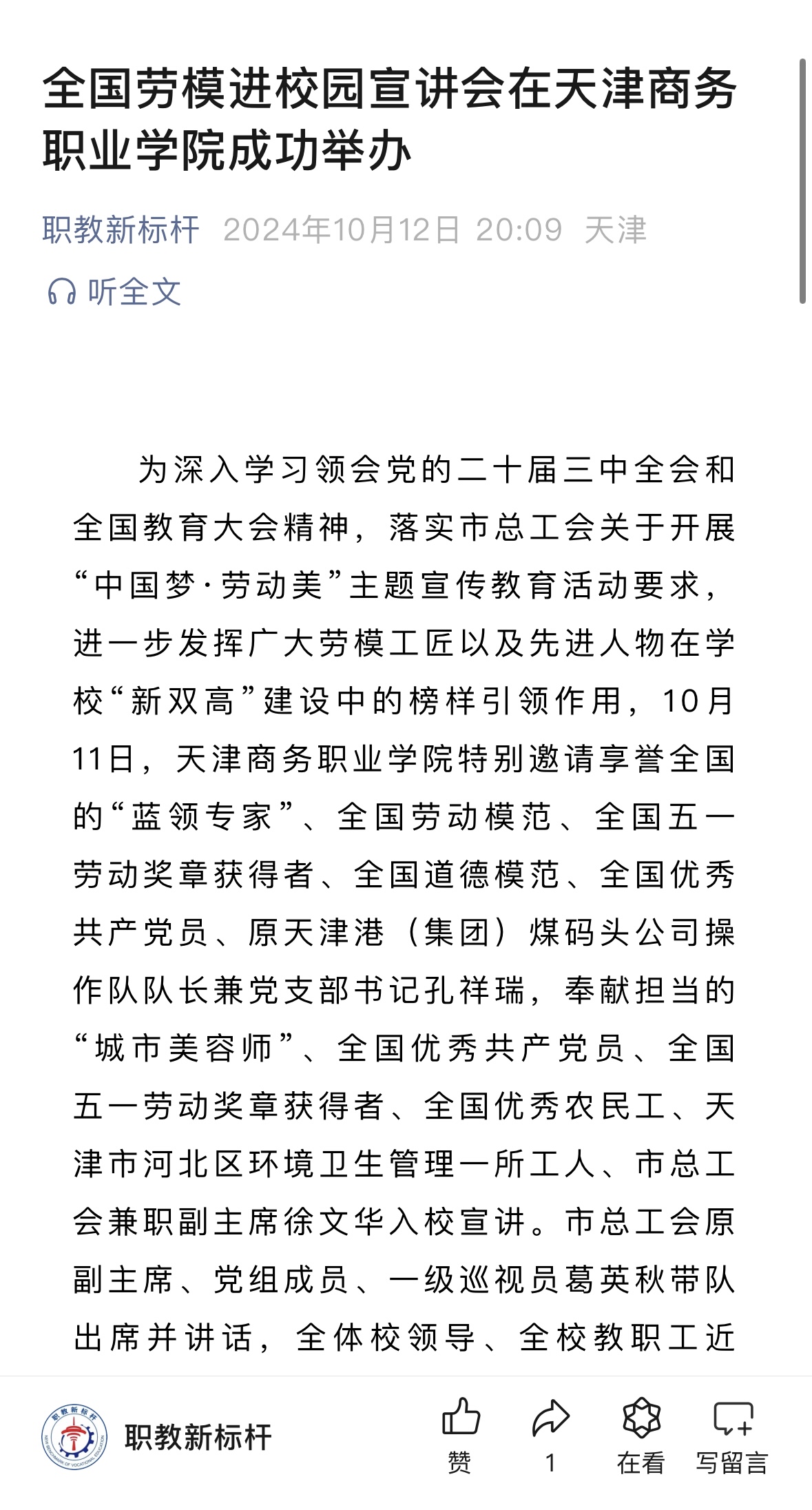 為深入學習領會黨的二十屆三中全會和全國教育大會精神,落實市總工會關于開展“中國夢·勞動美”主題宣傳教育活動要求,進一步發揮廣大勞模工匠以及先進人物在學?!靶码p高”建設中的榜樣引領作用,10月11日,天津商務職業學院特別邀請享譽全國的“藍領專家”、全國勞動模范、全國五一勞動獎章獲得者、全國道德模范、全國優秀共產黨員、原天津港(集團)煤碼頭公司操作隊隊長兼黨支部書記孔祥瑞,奉獻擔當的“城市美容師”、全國優秀共產黨員、全國五一勞動獎章獲得者、全國優秀農民工、天津市河北區環境衛生管理一所工人、市總工會兼職副主席徐文華入校宣講。市總工會原副主席、黨組成員、一級巡視員葛英秋帶隊出席并講話,全體校領導、全校教職工近500人聆聽,黨委書記馬雷主持會議。