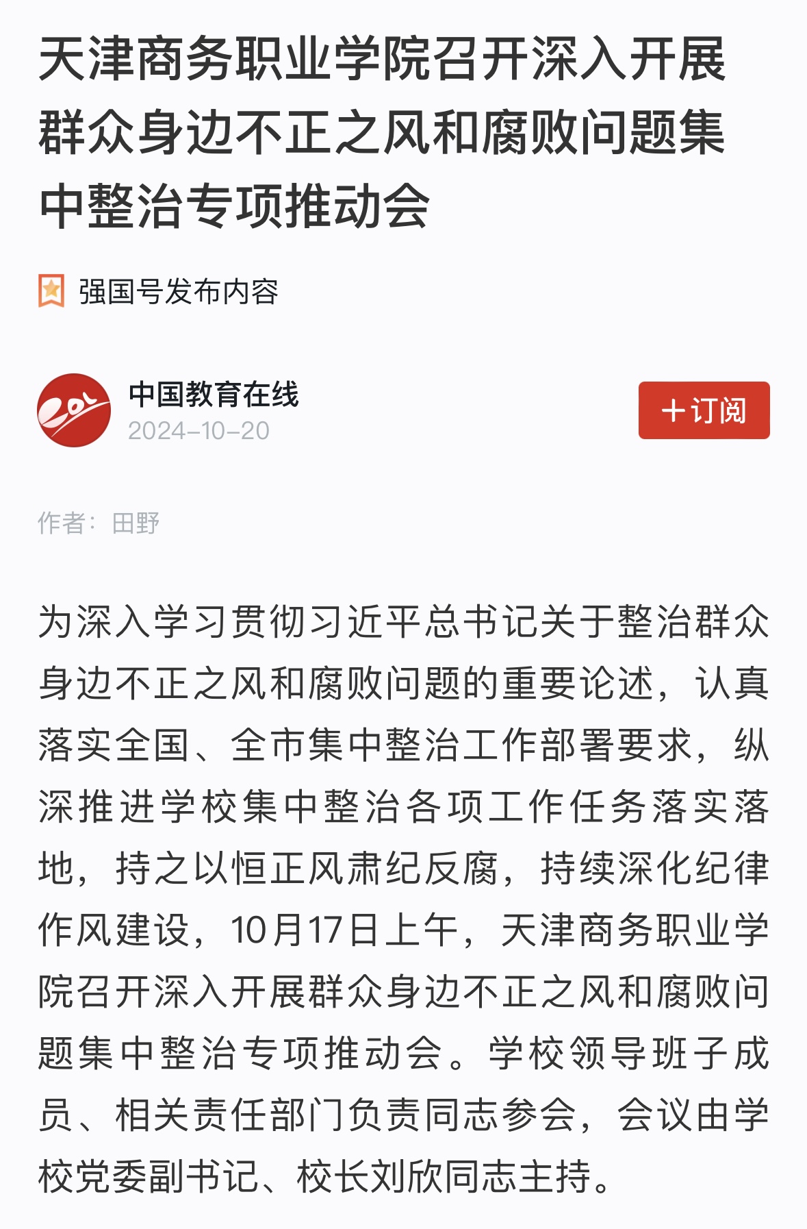 為深入學(xué)習(xí)貫徹習(xí)近平總書記關(guān)于整治群眾身邊不正之風(fēng)和腐敗問題的重要論述,認(rèn)真落實全國、全市集中整治工作部署要求,縱深推進(jìn)學(xué)校集中整治各項工作任務(wù)落實落地,持之以恒正風(fēng)肅紀(jì)反腐,持續(xù)深化紀(jì)律作風(fēng)建設(shè),10月17日上午,天津商務(wù)職業(yè)學(xué)院召開深入開展群眾身邊不正之風(fēng)和腐敗問題集中整治專項推動會。學(xué)校領(lǐng)導(dǎo)班子成員、相關(guān)責(zé)任部門負(fù)責(zé)同志參會,會議由學(xué)校黨委副書記、校長劉欣同志主持。