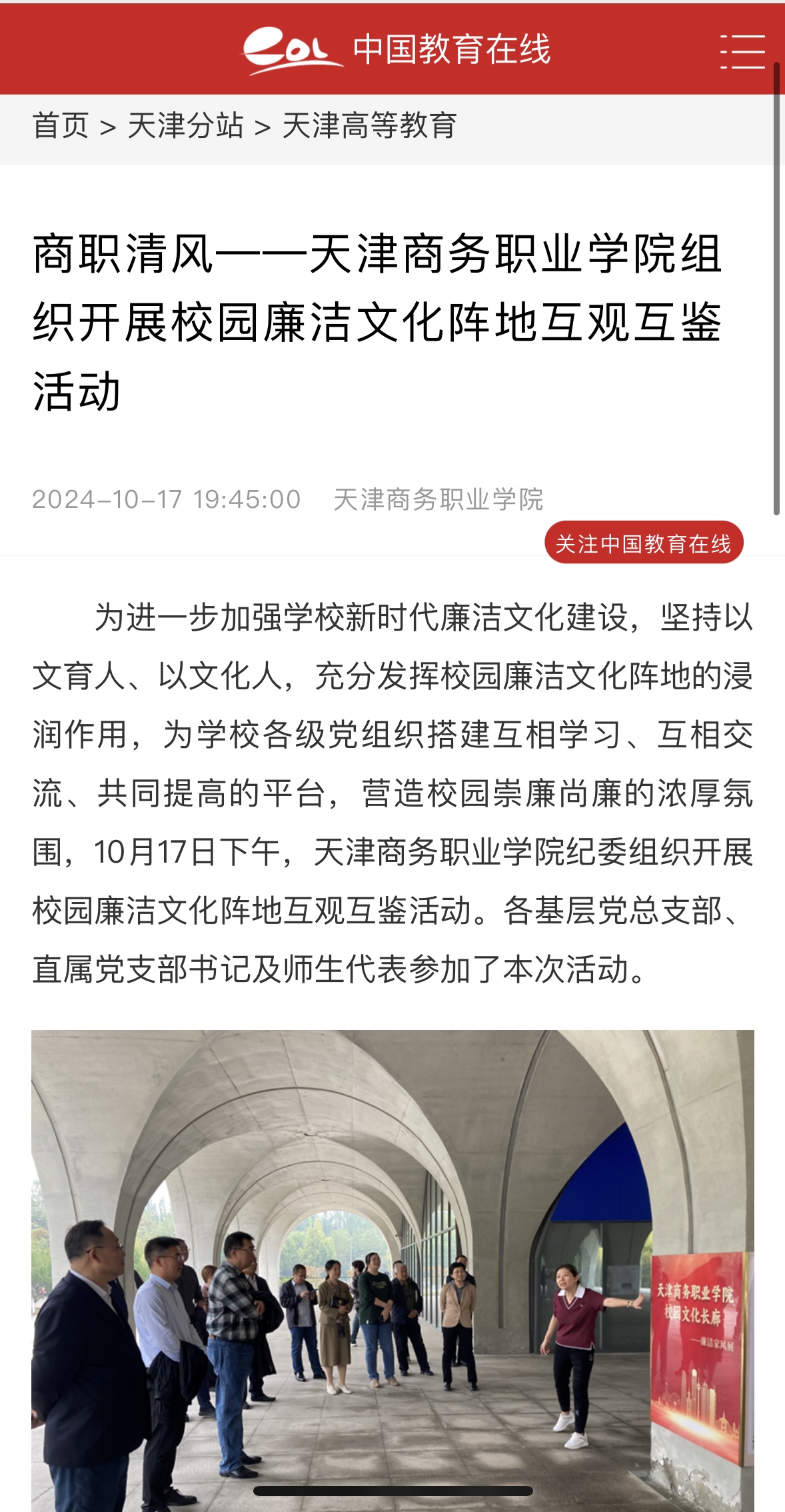 活動采取“現場觀摩、互學互鑒、現場交流”的方式進行,每到一處廉潔文化陣地的觀摩點,大家仔細聆聽講解員解說,認真學習觀看陣地建設成果,在一廳一廊里感受商職廉潔文化的亮點、在一字一畫間體會基層陣地建設的成效,互相學習、交流經驗、取長補短。