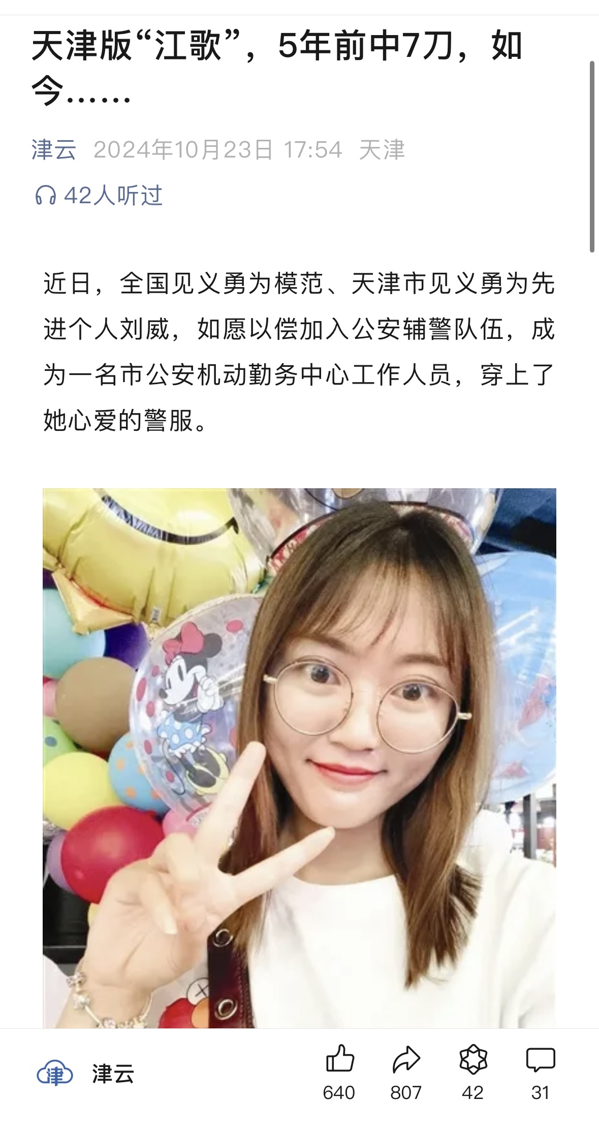 近日,全國見義勇為模范、天津市見義勇為先進個人劉威,如愿以償加入公安輔警隊伍,成為一名市公安機動勤務(wù)中心工作人員,穿上了她心愛的警服。